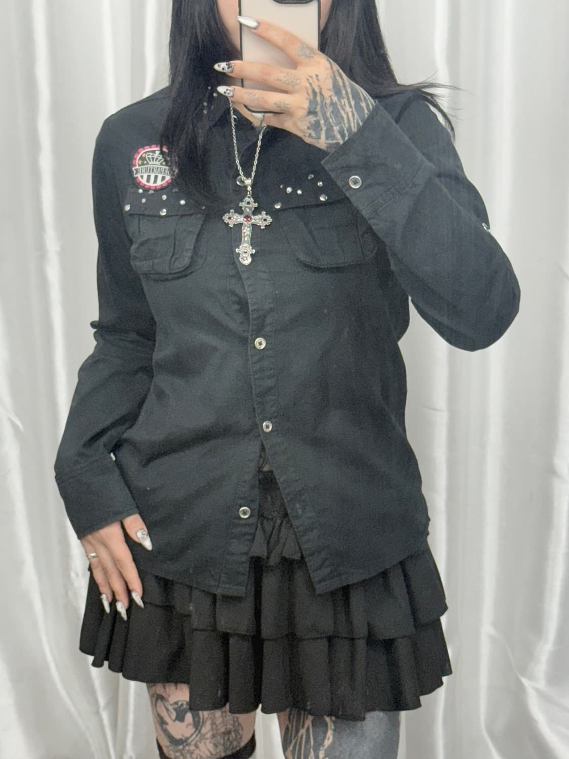 🎅 큐빅 포인트 백 프린팅 블랙 셔츠 총장 가슴 어깨: 61 43 40 (cm) SF-3858 📢빈티지 특성상 교환 및 환불이 불가하니 신중한 구매 부탁드립니다🙂 📢실측 측정방법에 따라 1~3cm 오차가 발생할수 있습니다 📢미처 발견하지 못한 미세 오염및 하자가 있을수 있으니 자세한 상세컷을 원하실 경우 문의주시면 감사하겠습니다 #산타구매가능