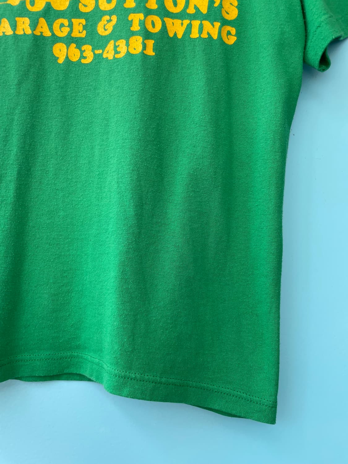1990's Vintage Russell Athletic T-shirt Made In U.S.A 미국 로컬 리틀야구팀 CHANDLER YOUTH BASEBALL의 팀복으로 실제 사용된 것으로 보이며, 전면에는 SUTTON’S GARAGE & TOWING이라는 지역 후원업체의 로고와 전화번호가 들어가 있어 당시 현지 분위기를 느낄 수 있는 소장가치 높은 아이템입니다. 야구 팀 티셔츠의 유니크하고 특유의 촌스럽고도 귀여운 무드가 담긴 티셔츠입니다! -size 실측(cm) 어깨 40 가슴 44 팔 15 총장 57 #빈티지티셔츠 #러셀