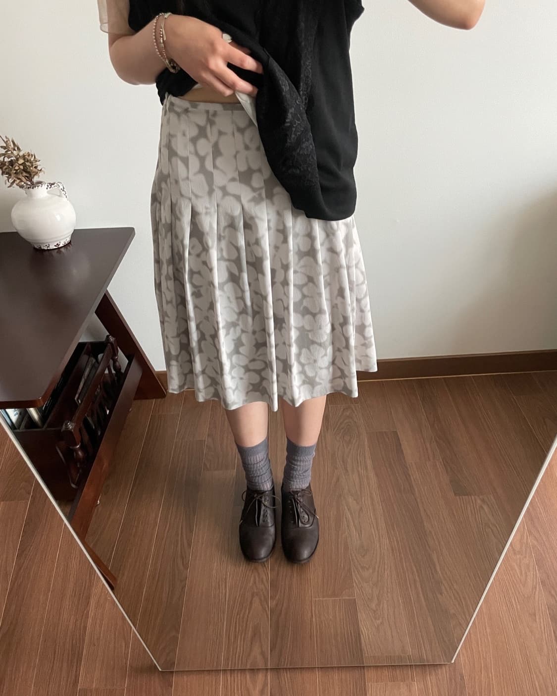 [color] gray [size] m [fabric] 폴리에스테르 100% [measurement] 허리 33.5 총장 60 [model size] 165 / s-m * 부드럽고 차르르 흐르는 소재감 * 오묘한 플라워 패턴 * 허리라인을 딱 잡아주며 밑으로 갈수록 A형태로 퍼지는 실루엣