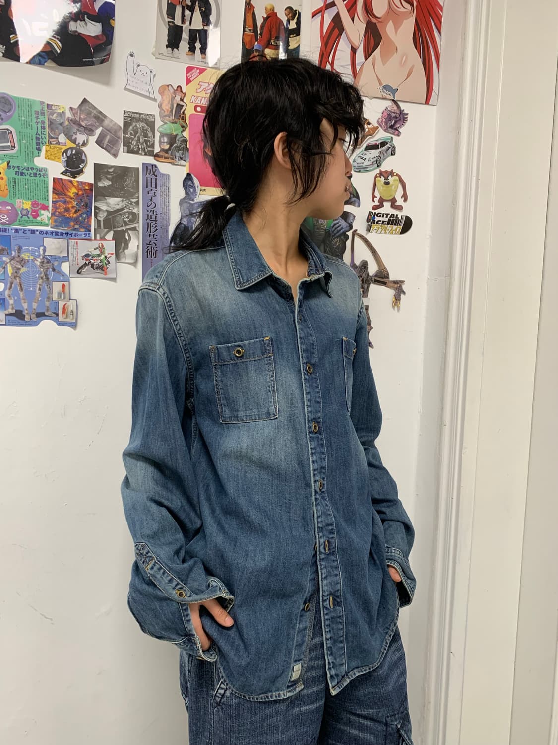 Timberland Denim Shirts •팀버랜드 전면 투포켓 디자인의 데님 셔츠 •루즈한 사이즈감 -어깨 48cm 가슴 55cm 기장 73cm ( 표기 사이즈 L ) -Price : 40,000