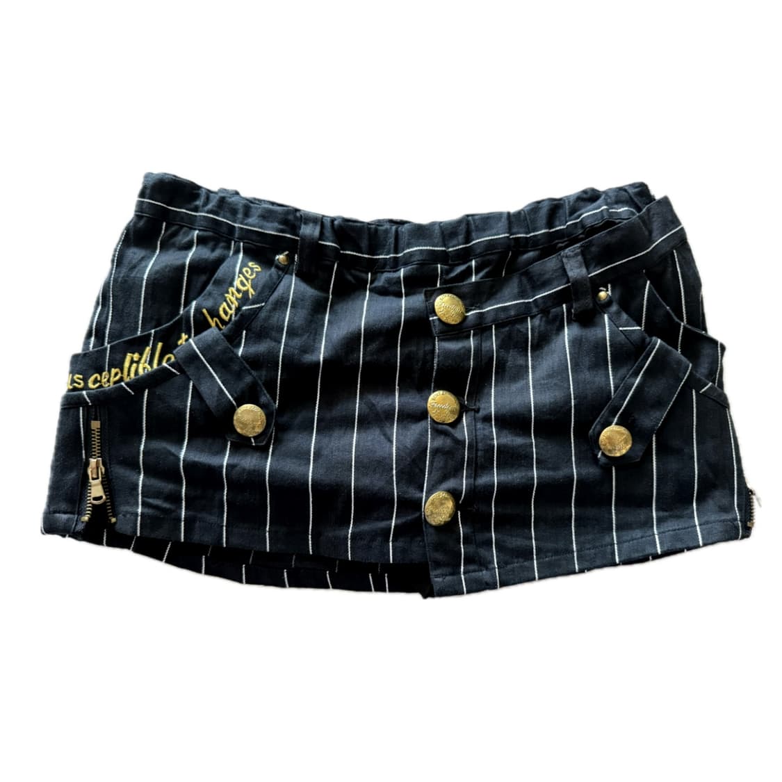 허단 40(밴딩)으로 골반에 걸쳐 입는 짧은 치마입니다! 허리가 크지만 벨트 고리가 있기도 하고, 밴딩부분에 두꺼운 레더 갸루 벨트 해주시면 돼요 이거 하나로 끝장납니다... 기장은 27로, 골반에 걸쳤을 때 노출이 심하지 않지만 짧다 싶은 기장감이라고 생각해주시면 될 것 같습니당 길지 않게 속바지도 내장되어있습니다! 골드 버튼과 골드 지퍼로 포인트가 있고, 은색 세로 줄무늬가 반짝반짝 빛나는 블랙 컬러 치마입니다. 색감 자체는 생블랙보다는 남색블루에 가깝지만 블랙 상의랑 입었을 때도 이질감이 크지 않은 어두운 컬러입니다! 빈티지 플리마켓에서 구매한 일본 빈티지이며 구매 당시 가격은 7.8이었습니다 디자인이 레어하기도 하고 진짜 오네갸루 룩 어디에나 다 어울려서 절대 다시 팔기 싫었는데... 🥺 제가 허리가 정말 긴 체형이라 로우웨이스트가 너무 안 어울려서 눈물 머금고 보내주기로 결심했습니다... 안 팔고 싶어지면 내릴 겁니다 ㅜㅜ