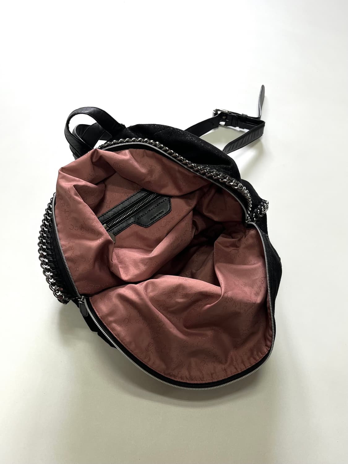 STELLA MCCARTNEY MADE IN ITALY YKK ZIPPER 스텔라 매카트니의 스테디 제품인 파라벨라백의 백팩 모델 제품 입니다 파라벨라 특유의 가공 레더와 체인 디자인이 매력적인 제품입니다 무게가 가볍고 일상용품을 보관하기에 용이한 사이즈의 제품 입니다 size: os (가로 36 세로 40) condition: 8/10 (가방 끈 부분 사용감 존재하나, 그 외 괜찮은 상태의 제품)