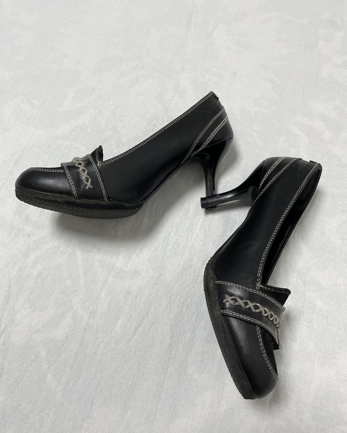 Dior Shield Buckle Pumps *Price 12.0 기묘한 조형미가 살아있는 디올의 고딕 펌프스입니다. 견고한 블랙 가죽에 도톰한 화이트 스티치, C 엠블럼을 활용한 더블 벨트 디테일이 인상적입니다. 웨스턴적 상징과 퓨처리즘의 결합으로, 다크웨어 스타일링의 시그니처 아이템으로 활용하기 좋습니다. 페미닌한 실루엣 위에 다소 과감한 갑피 구조가 얹히며, 구버전 디올 특유의 건축적인 무드가 선명히 드러납니다. 아카이브 무드와 브랜드의 헤리티지를 모두 조망할 수 있는 하이힐입니다. *Heel 7cm *Pumps 3cm *Size 35.5 *Condition 8.5/10 Instagram followers get 10% off