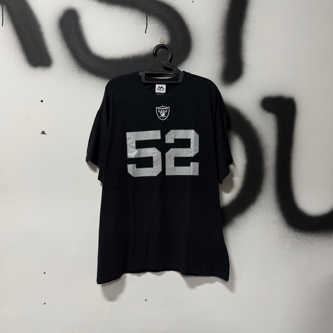 미국의 미식축구 선수인 카릴 맥의 마킹이 들어간 입단 팀인 오클랜드 레이더스 반팔 티셔츠입니다. 레이더스에서 시작하여 현재는 현역으로 시카고 베어스에서 활약 중인 선수로 소장가치가 꽤 있는 제품입니다. 택표기 XL 사이즈로 국내 105-110 정도의 사이즈감 입니다. 어깨 : 62 가슴단면 : 62 총장 : 76 모든 치수는 센치 기준입니다. 여러상품 혹은 쿨거래시 할인 가능합니다!
