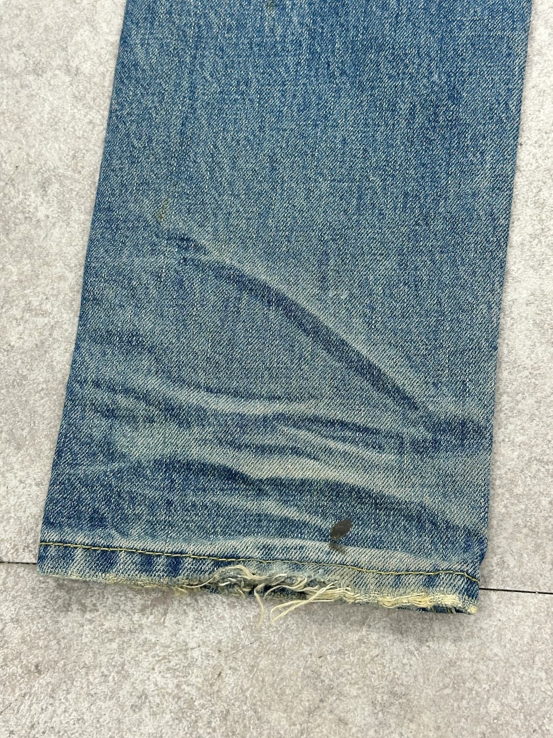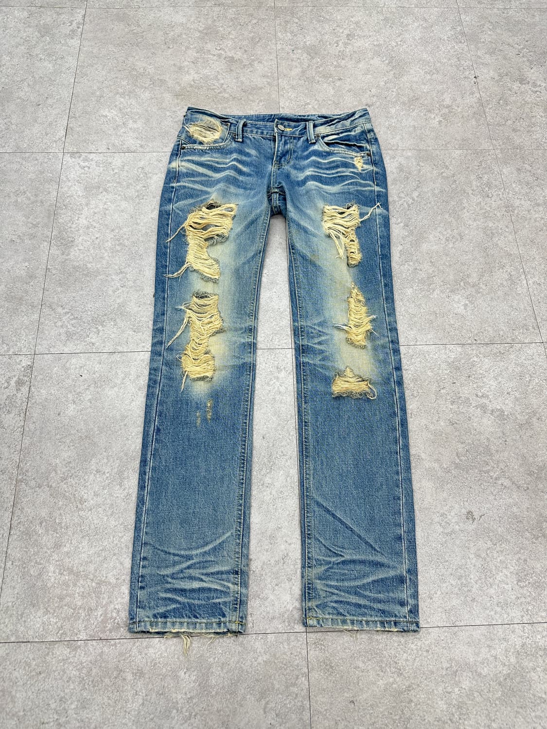 SKULL destroyed fade jeans detail: 허리 41 허벅지 28 밑위 22 밑단 17 엉덩이 50 총장 102 condition: B (후면 밑단 부분 오염) Size: 28 price: 38,000