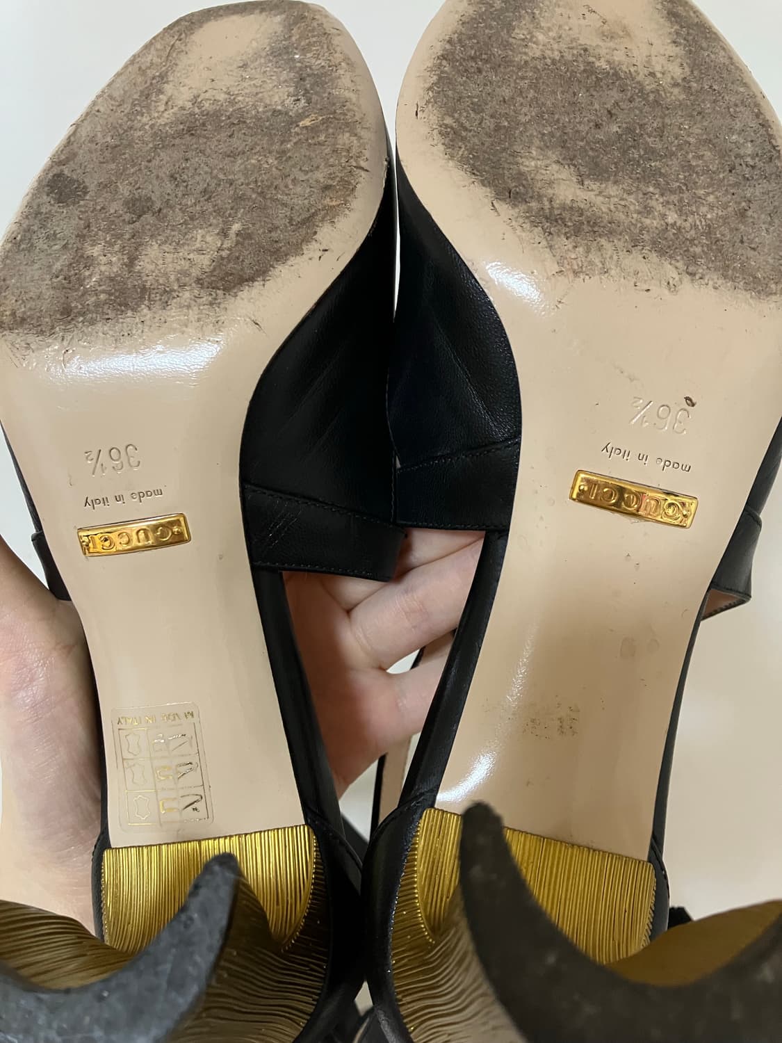 Gucci 구찌 리본 진주 글래디에이터 슈즈 정가255만 보관상 앞코 부분에 데미지가 있으나 블랙이라 눈에 잘 띄지 않습니다. 36 1/2사이즈로 240mm 기재되어있습니다. 런웨이 상품이구요 박스도 필요하시면 드립니다! 진주 하나하나에도 구찌 마크가 있고 리본 디테일이 정말 예뻐요!! 비브람은 하지 않았으나 젖은 곳을 딛거나 한 적은 없습니다. 뒷지퍼로 탈착 간편합니다!