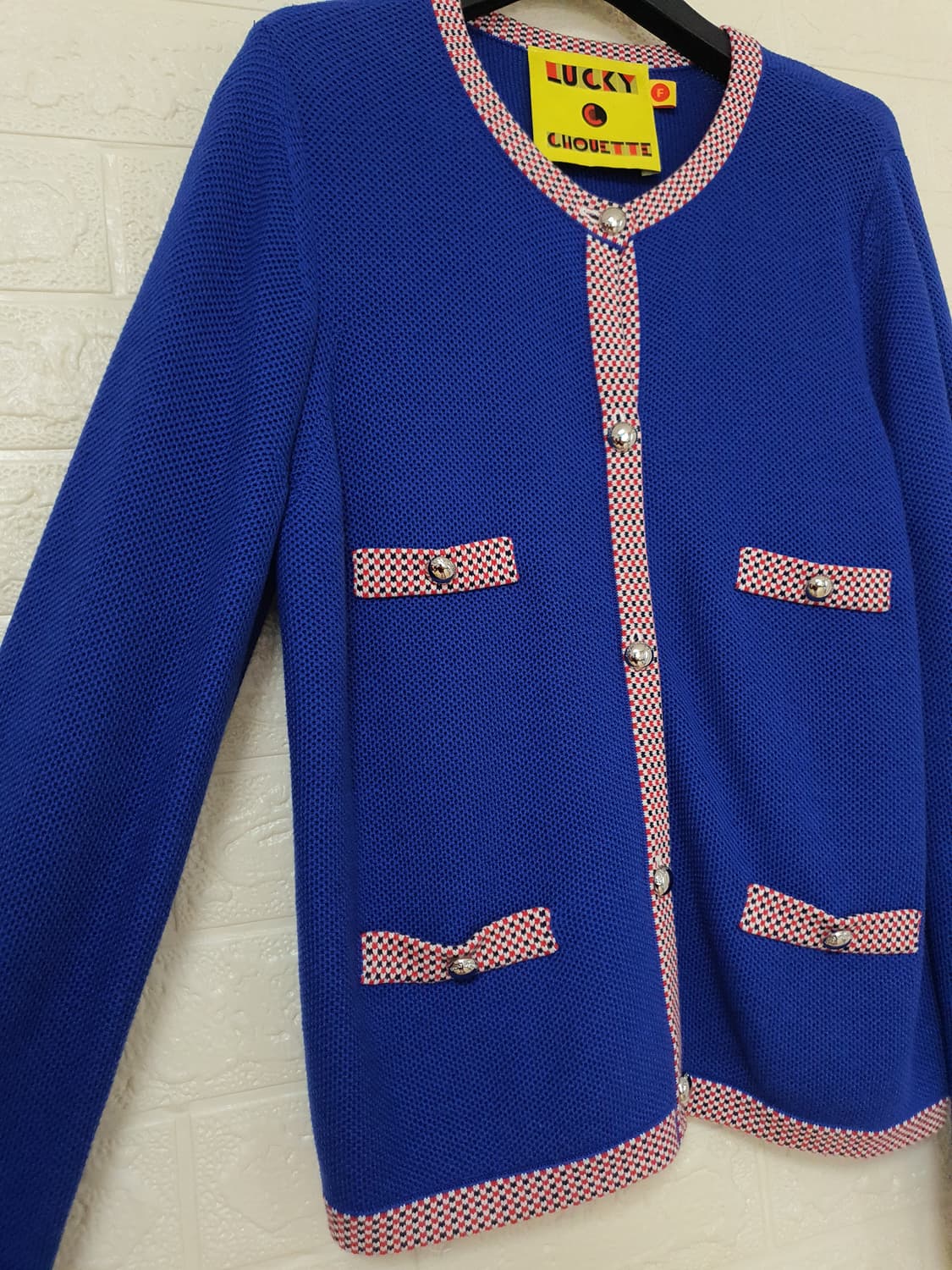 럭키슈에뜨 블루 라인 가디건 사이즈 F 총장 58 가슴반품 45 럭키슈에뜨 가디건으로 사이즈 프리이고 블루 컬러, 배색감 있는 라인으로 포인트 되는 아이템입니다. 전면 단추 여밈, 포켓 디테일, 은장 단추 있어요. 컨디션 좋은 편이지만 중고이니만큼 예민하신 분은 사양합니다. 배송비는 별도 3,300원이며 반품 어려우니 신중 구매 부탁드려요.