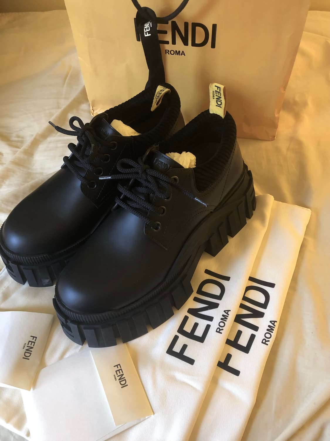 펜디 포스 레이스업 슈즈 270-280 사이즈까지 신을수 있는거 같아요 두번째 사진과같이 매장에서 구매했을때 구성품 다 받은 정품입니다. 현재는 신발 단품+ 사용감 고려해서 저렴하게 판매합니다 구매했을때 100중후반 줬던걸로 기억합니다. 와이드팬츠로 신발 덮어신으면 이쁜 제품입니다 계좌 거래시 택배비 빼드립니다~