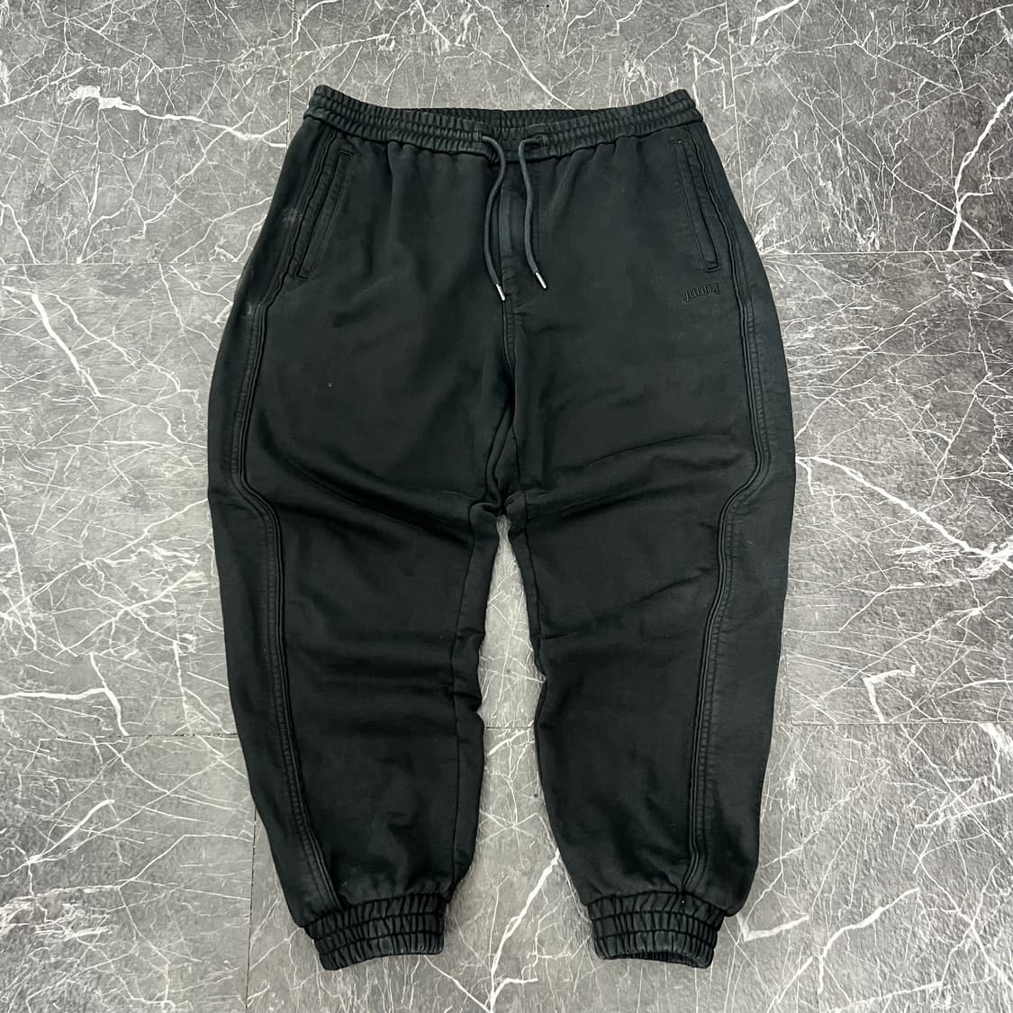 #준지 ✔️사이즈(size):50 (L) ✔️컨디션(condition):10/8.5 ✔️가격(price):15.0 -허리 34in (허리 끈 밴딩 조절가능) 밑위 32 허벅지 36 총장 94 ✔️와이드 & 조거 핏감 ✔️준지 시그니처 사이드 파이핑 디자인감 ✔️스웻 소재감 & 블랙 컬러감