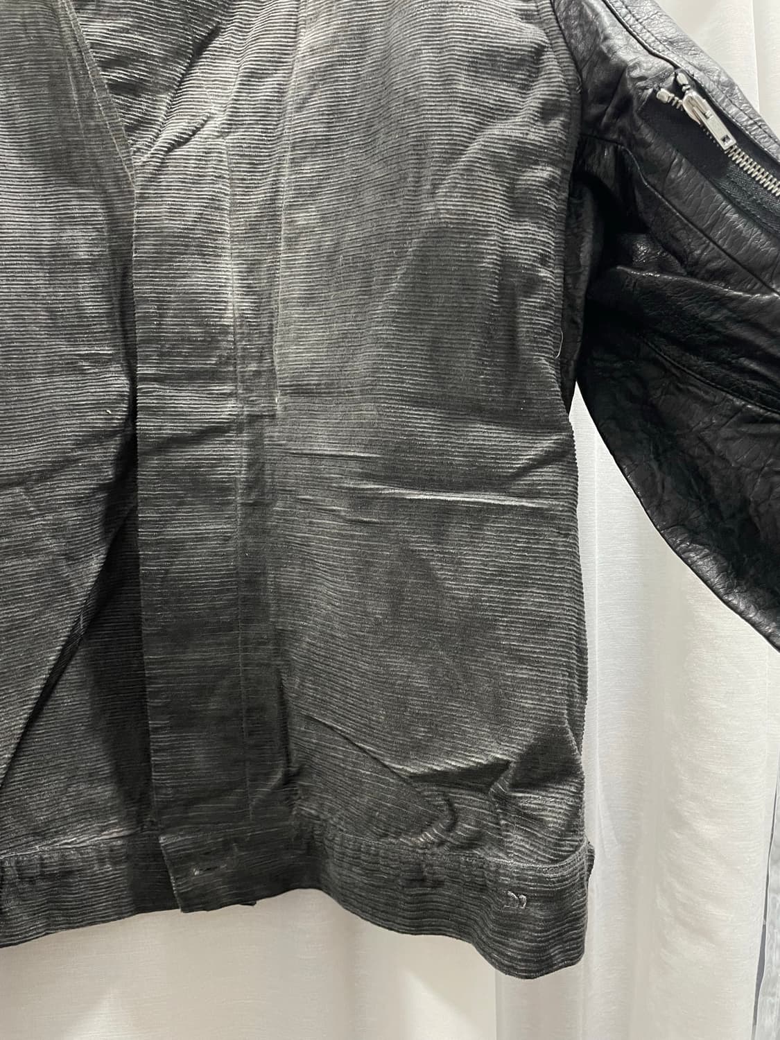 릭오웬스/ 사선 슬레이브 팔가죽 자켓/ L 코듀로이 데님 소재의 팔가죽 사선 슬레이브 자켓 일반적인 데님이 아닌 코듀로이 데님으로 스티치, 패턴 등에 따라 불규칙적으로 워싱이 생긴 패턴이 굉장히 예쁜 제품 왼쪽 팔뚝에는 MA1처럼 포켓 디테일이 들어가 있고 소매 끝은 지퍼로 마무리돼있습니다 릭오웬스 자켓들이 참 예쁜데 기장이 대체로 길어 요즘 입기 조금 어려운데 드물게 크롭하게 나온 디자인 등판에 포켓 있고 안쪽에는 스트랩 있는 시기의 명작입니다 장담컨데 이 정도 컨디션의 제품은 구하기 정말 쉽지 않을 겁니다 릭 매니아 분들이라면 모두 알만한 제품입니다 사용감 적은 자켓 단품 표기사이즈 L, 실사이즈 100 전후 어깨47.5 가슴51.5 팔기장73 총기장65