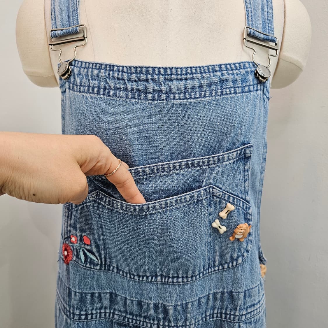 플라워 자수와 귀여운 강아지 단추가 포인트인 멜빵바지입니다^^ 앞주머니가 있어 더욱 귀여운 느낌이예요 빈티지특성상 세월의 흔적 2군데 있어요(마지막 사진 2장 참고해주세요) Size(cm) 가슴단면 47 총길이(끈제외) 103 < 사이즈 > L Fabric 면 100% 신축성 있음 / 비침 없음 / 촉감 부드러움 -------------------------------- ■ 빈티지 특성상 사용감&데미지 있을 수 있습니다 (최대한 사진에 표현드리겠습니다) ● 사이즈 재는 방법에 따라 오차 있을수 있습니다 ◇ 교환X 환불X (사전협의제외) (신중한 구매 부탁드립니다) ○ 7만원 이상 무료배송 ☆ 궁금하신점 언제든지 문의바랍니다
