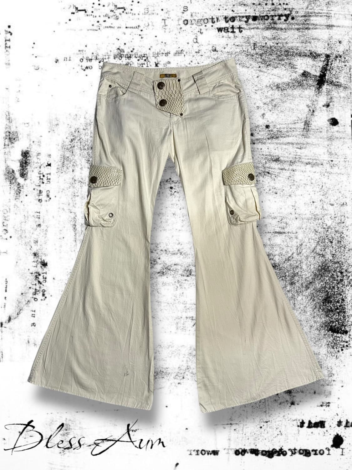 SLY - Linen Snake Detail Flare Cargo Pants 브랜드‘SLY’는 일본 도쿄 기반의 브랜드로, Y2K 감성과 웨스턴 무드를 중심으로 감각적인 믹스 스타일을 선보입니다. 아이보리 컬러 린넨 소재 베이스의 플레어핏 실루엣 카고 팬츠로, 버튼 플랩, 사이드 포켓, 백 포켓에 스네이크 텍스처 디테일이 더해져 텍스처 대비가 매력적이며, 와이드한 플레어 핏이 돋보이는 제품입니다. (밑위가 많이 짧은 로우라이즈 제품으로 착용시 실측 기장보다 긴 기장감입니다.) 허리 31inch 밑위 18cm 허벅지 29cm 총기장 96cm 밑단 38cm