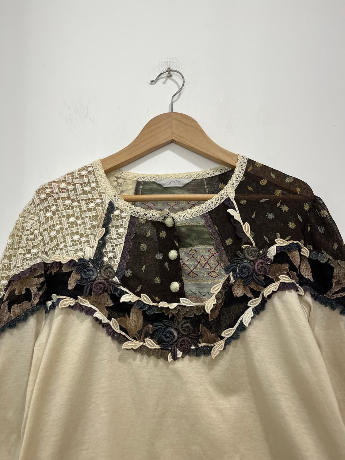 Size: (어깨/소매/가슴/총장) 40/37/51/54(cm) 상태 좋음 어깨 비침o, 레이스, 패치, 자개 버튼