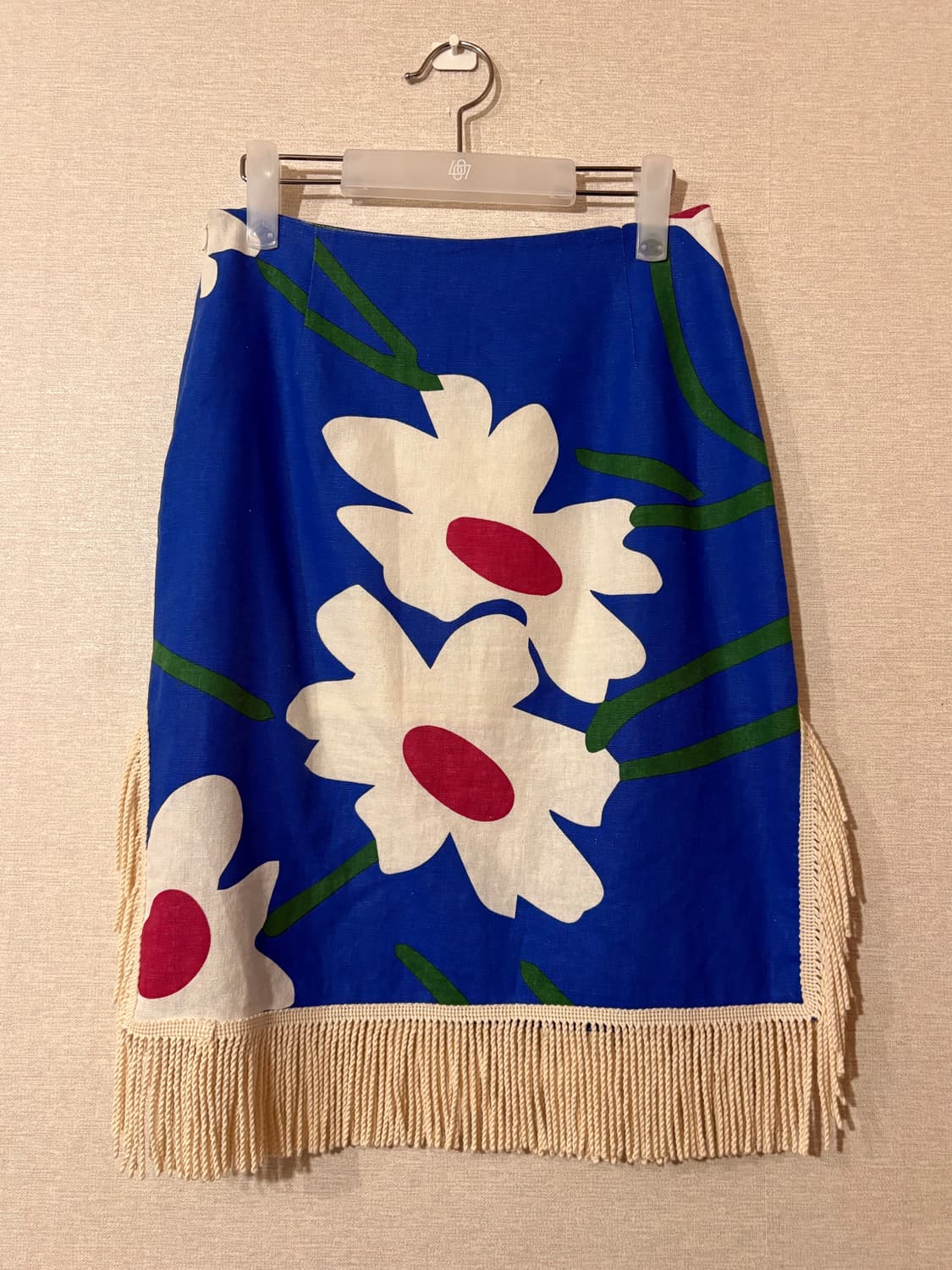 사이즈: os ( ~27까지 추천) 상태: A 플라워 프린트 태슬 스커트 - 블루플라워 거의 새상품 구매 후 시착만 해봤습니다 안감 신축성이 없어서 옆 봉재만 풀어뒀어요 다시 재봉하시면 원상태로 복구됩니다 마 소재 특성상 올 튄 부분 몇 군데 있지만 상태 좋아요
