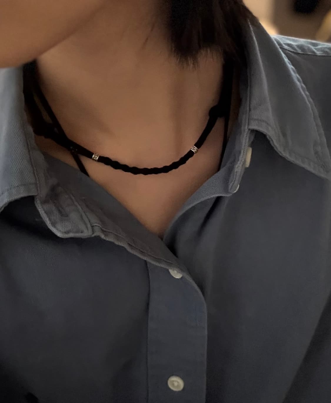 스웨이드 끈을 사용하여 내추럴한 질감을 살린 빈티지 무드의 브레이드 초커입니다. 중앙 부분은 정교하게 엮은 브레이드 디테일로 포인트를 주었으며, 양쪽 사이드의 작은 실버 비즈로 은은하게 무드 있는 디테일을 더해 주었습니다. 다른목걸이와 레이어드 해서 착용해도 좋아요. * 짧고 널널하지 않게 착용하는 목걸이 입니다 구매전 사이즈를 꼭 확인해주세요 :) - 기본 사이즈: 최소길이 34cm 최대길이 43cm (목이 얇은 분들한테 추천드려요) - long ver. : 최소길이 40cm 최대길이 48cm