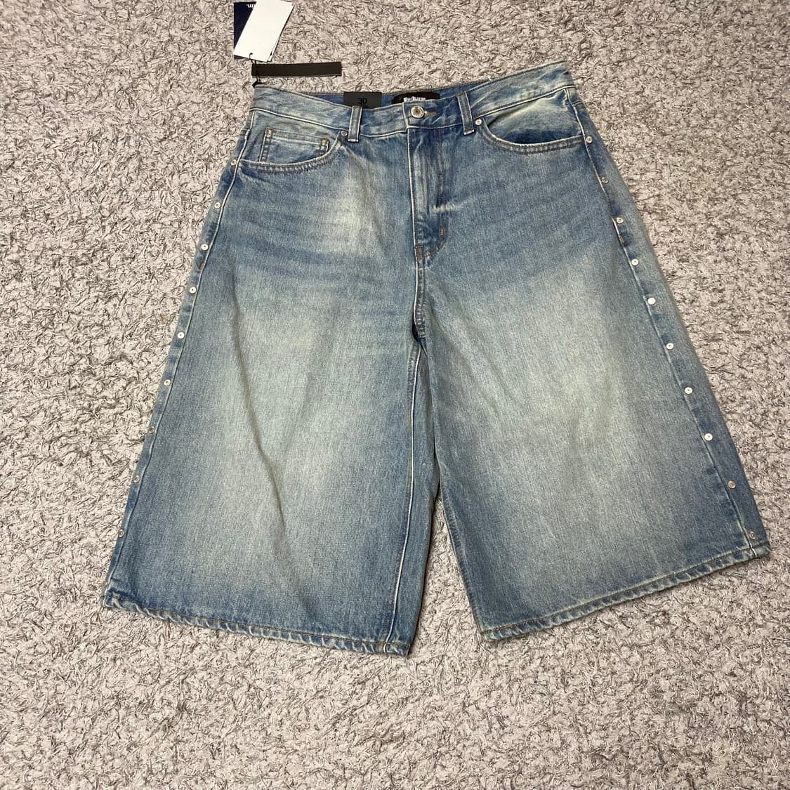사이즈 30-31 허리단면 42, 밑위 32, 엉덩이 58, 총장 67 딥블루 와이드 버뮤다 워싱 데님 6-7부 길이감 사이드 리벳 디테일 남여공용 양호함 반품, 환불 불가입니다 실측 확인하시고, 신중한 구매 부탁드립니다