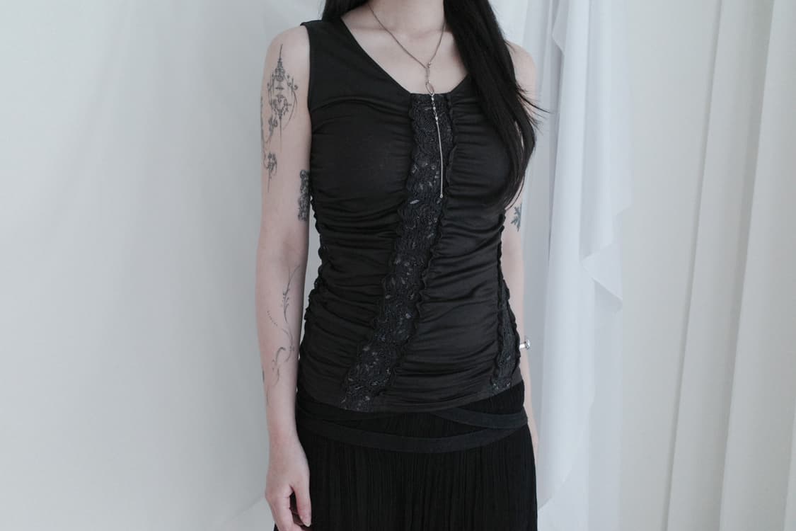 셔링 슬리브리스 -사선 레이스 배색 디테일 -전체적인 셔링 디테일 -슬림한 실루엣 SIZE(S) 어깨 : 30 가슴 : 44 총장 : 61 (cm)