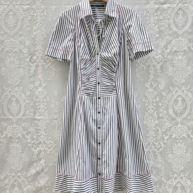 bluegray stripe pearl button puff sleeve midi opc(size-36) 블루그레이 스트라이프 진주 버튼 퍼프 슬리브 미디 원피스 #일본빈티지 #발레코어 #모리걸 #러블리 #히메갸루 #라떼갸루 #코티지신드롬