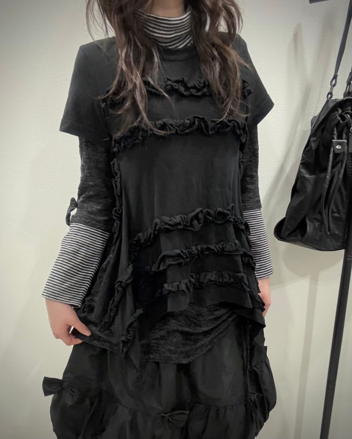 레이 가와쿠보가 이끄는 꼼데가르송은 기존의 의복 구조를 파괴하고 재조합하는 실험적인 디자인으로 전 세계 패션 씬에 거대한 영향력을 행사합니다. 입는 사람의 개성에 따라 형태가 변화하는 독창적인 패턴과 아방가르드한 감성은 대체 불가능한 브랜드의 자산입니다. 전면을 가로지르는 입체적인 러플 디테일이 압도적인 존재감을 드러내는 슬리브리스 탑입니다. 꼼데가르송 아카이브에서 자주 볼 수 있는 비대칭적인 볼륨감이 특징이며, 브랜드 고유의 반항적인 무드가 잘 녹아있습니다. 단독으로 착용했을 때 어깨와 가슴 라인의 실루엣이 드라마틱하게 연출되며, 자켓이나 가디건 안에 이너로 매치하여 러플을 밖으로 꺼내 입는 레이어드 활용도도 매우 높습니다.