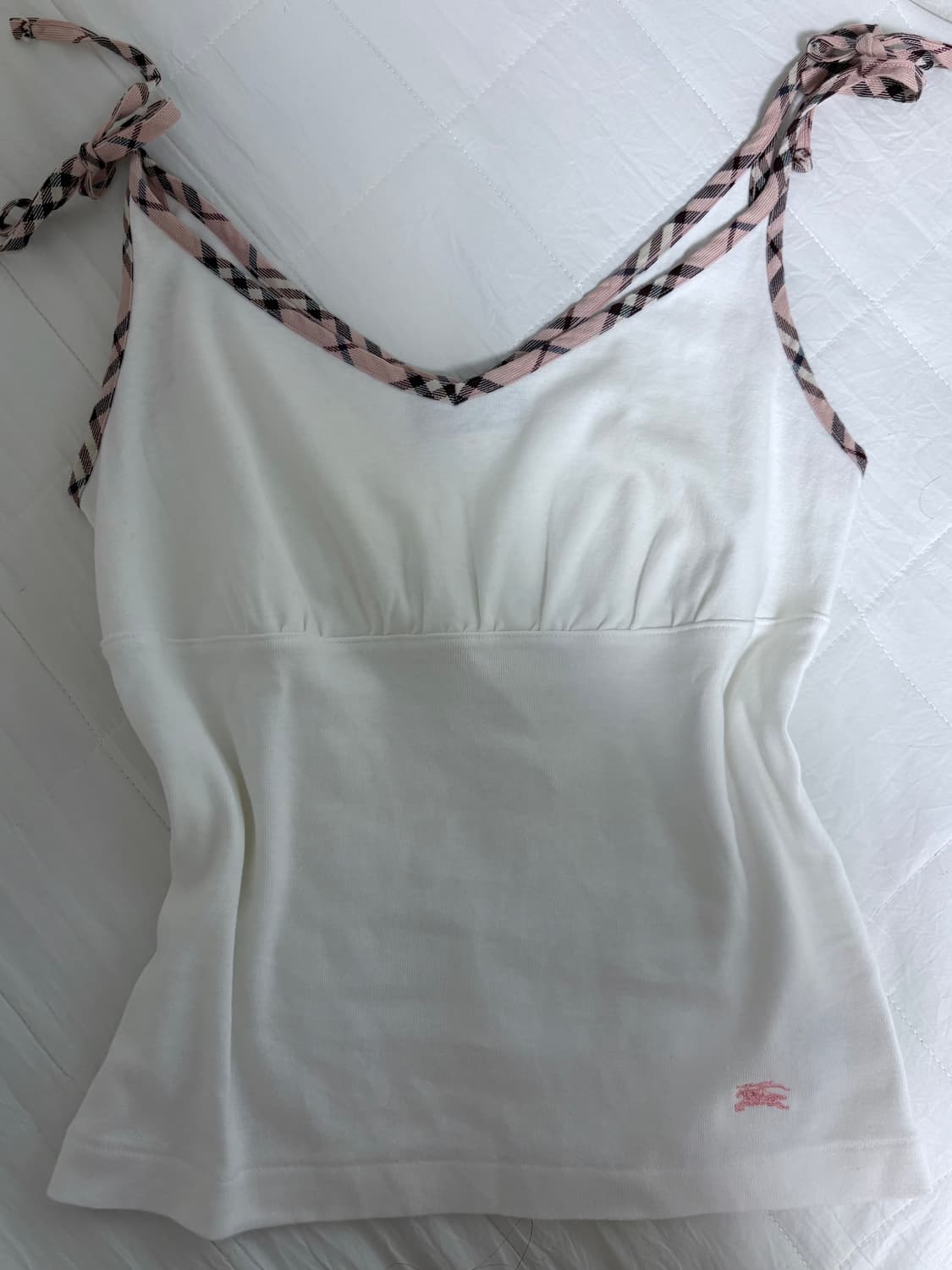 버버리 블루라벨 흰핑크 로고 노바체크 리본 롱슬리브 빈티지 로걀탑 핀터