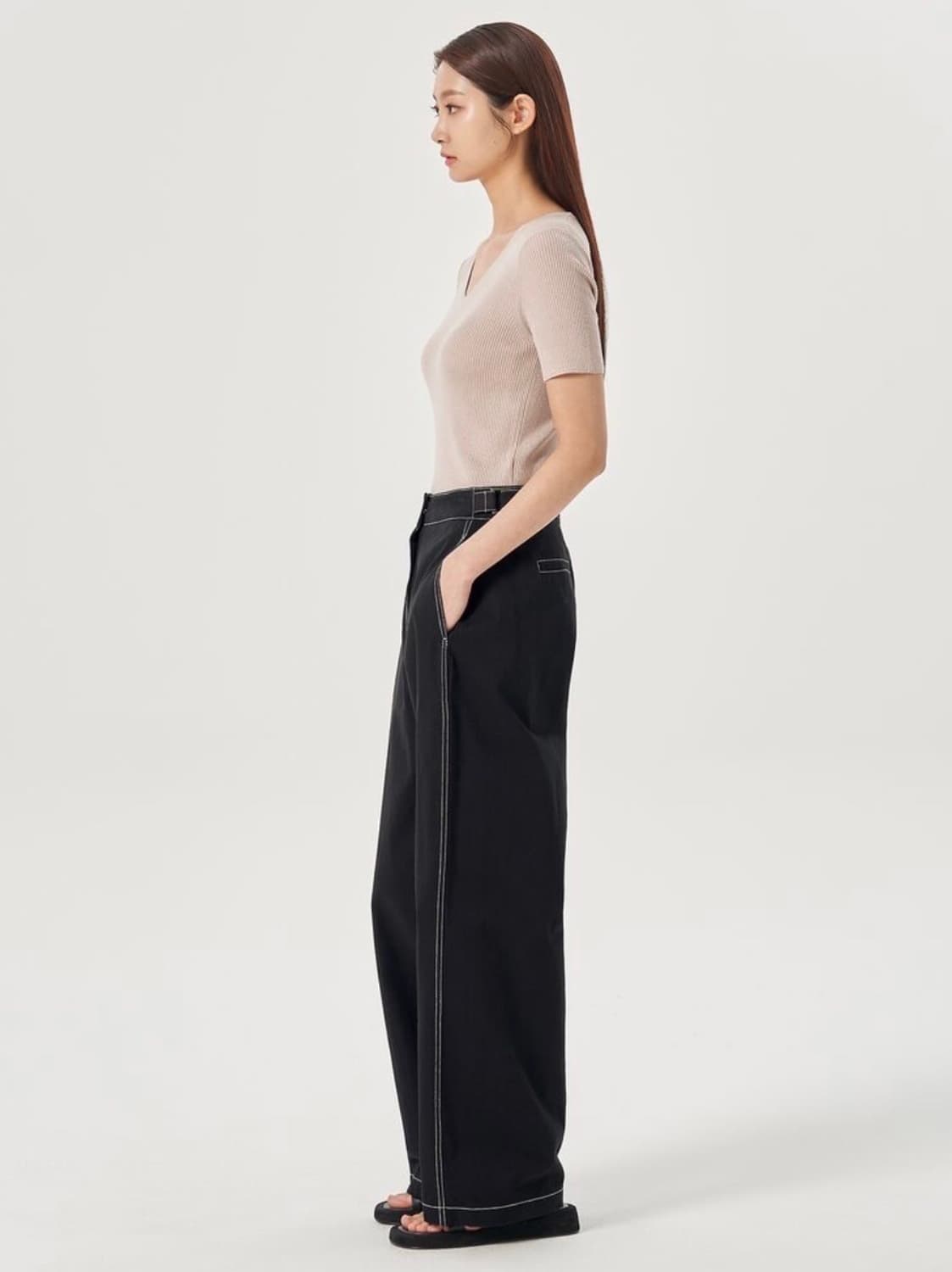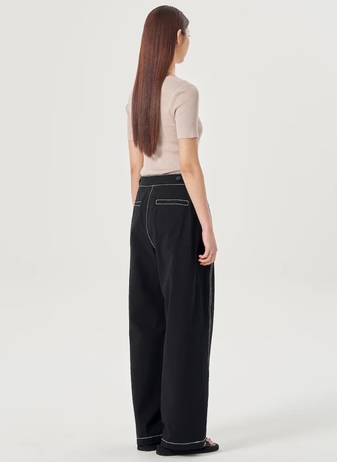 코튼 스티치 팬츠 (M) 에잇세컨즈 블랙 색상 면바지입니다. 흰색 스티치가 포인트로 들어가 있어서 유니크합니다. 와이드 레그 핏으로 편안하게 착용 가능합니다. 상태 새상품 정가 33,746원 판매가 5,000원