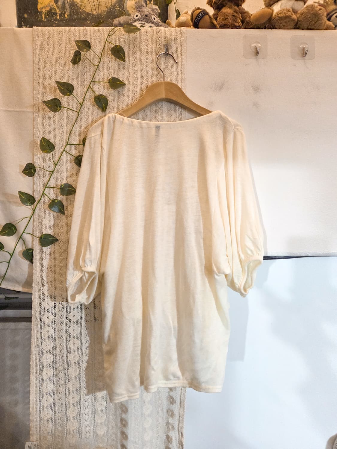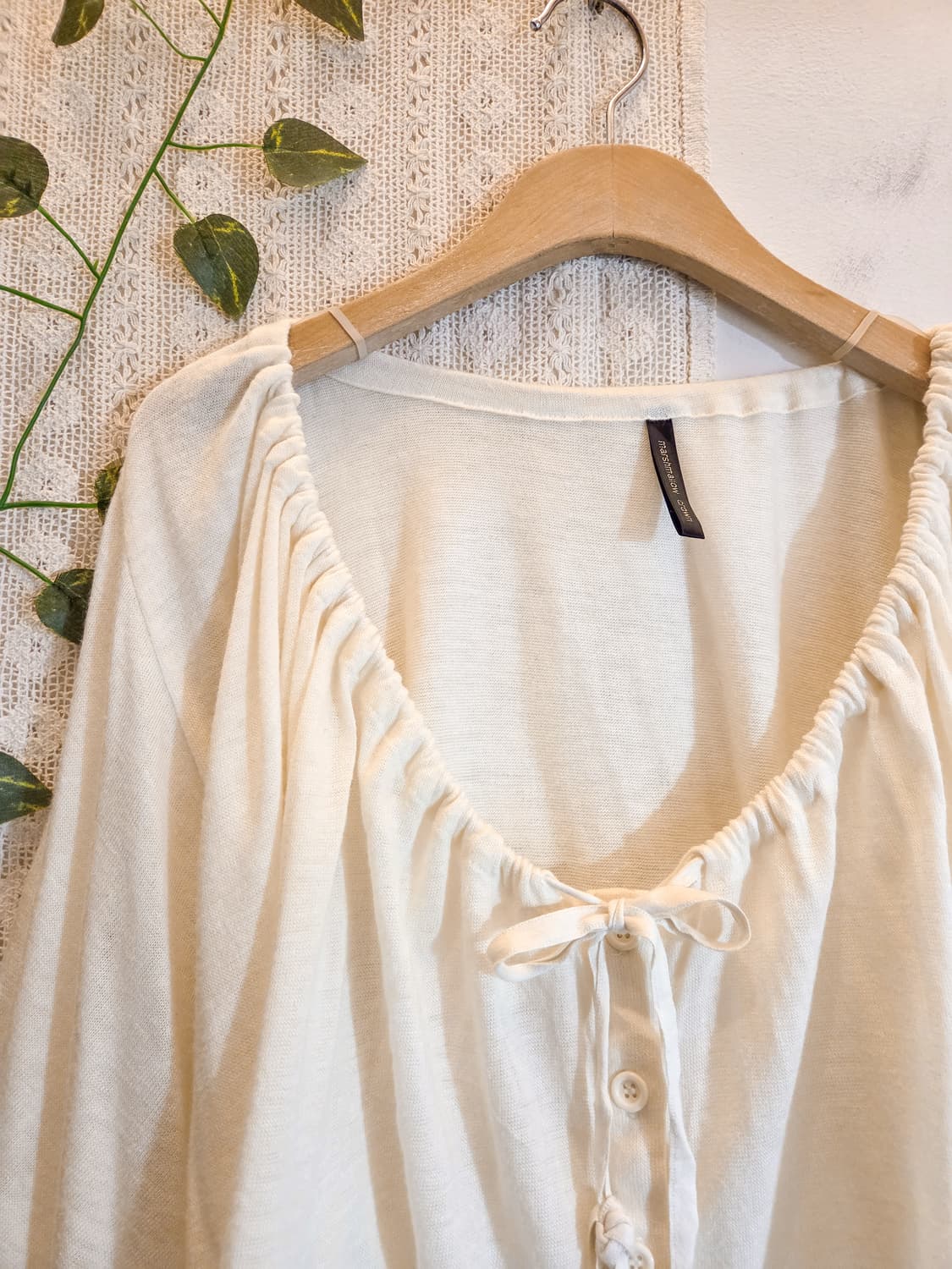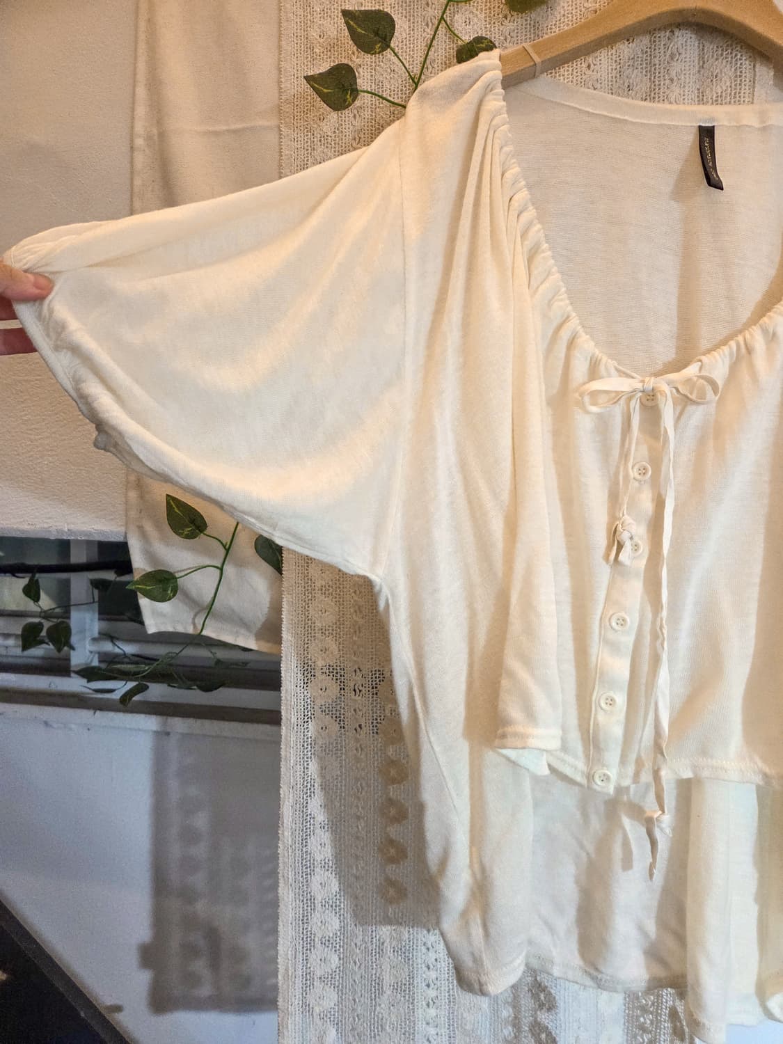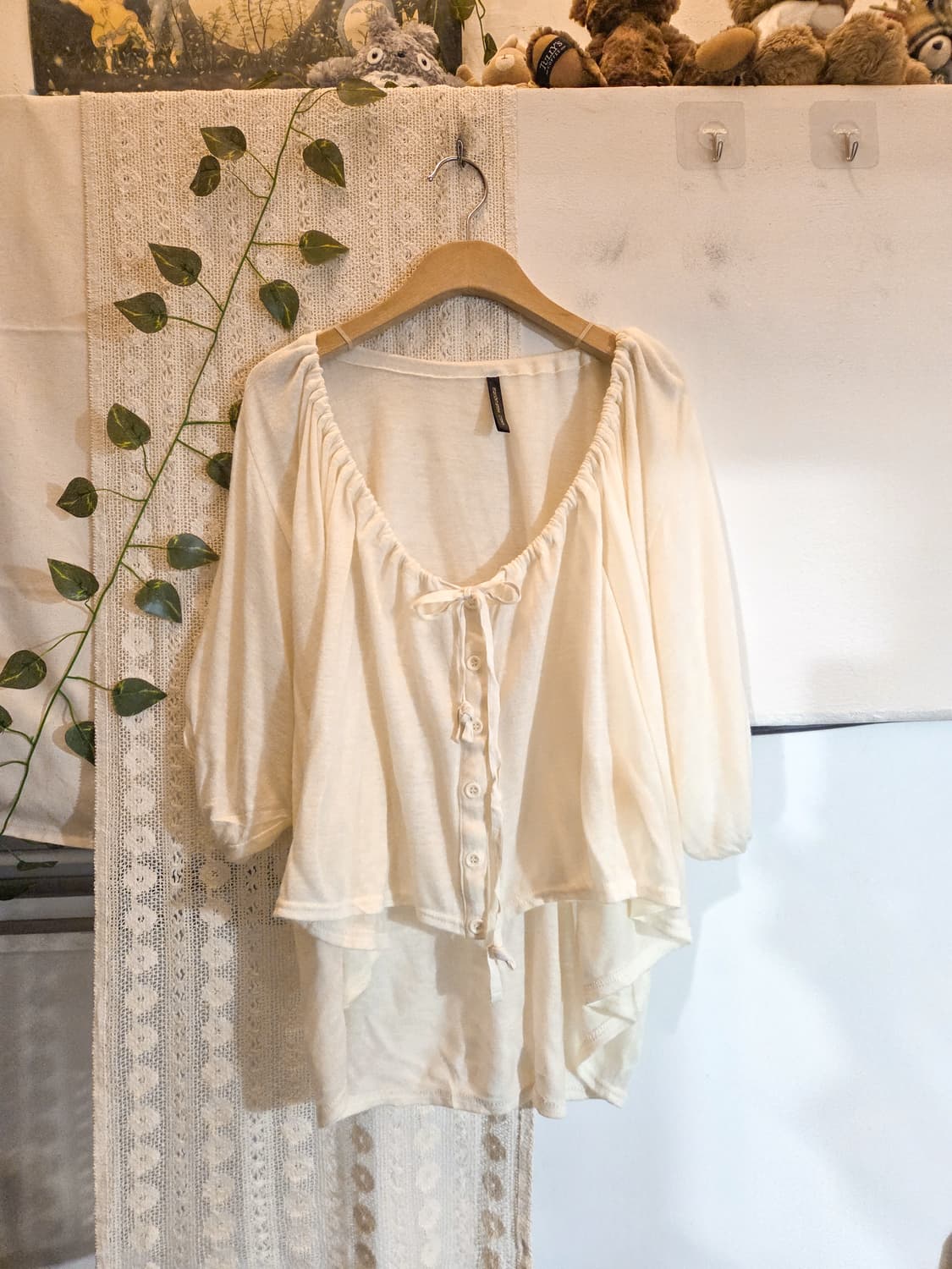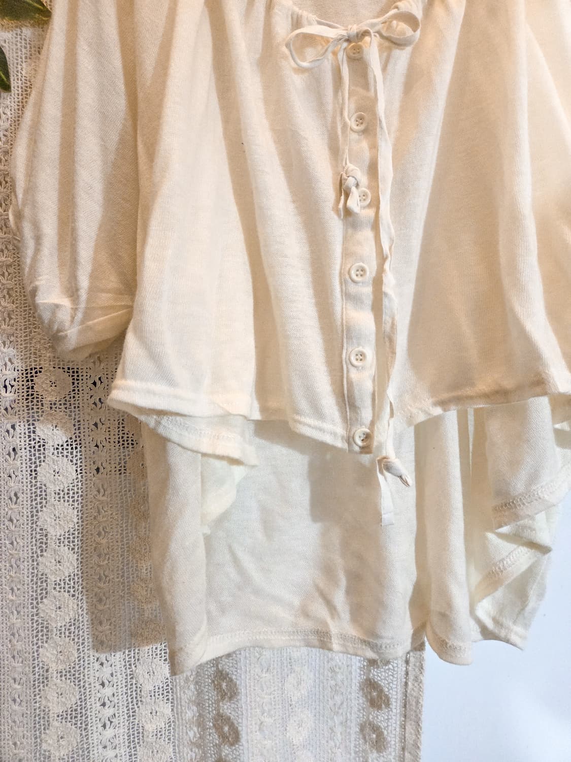 오버핏 반팔 가디건입니다! 넥라인 끈을 조여서 리본 묶어주는 방식이에요- 컨디션 깔끔합니당 :) 레이어드 활용하시기 좋아요! 사이즈 ; 가슴단면 53 총장 50~65 (언발) 소재 ; 아크릴60 레이온40
