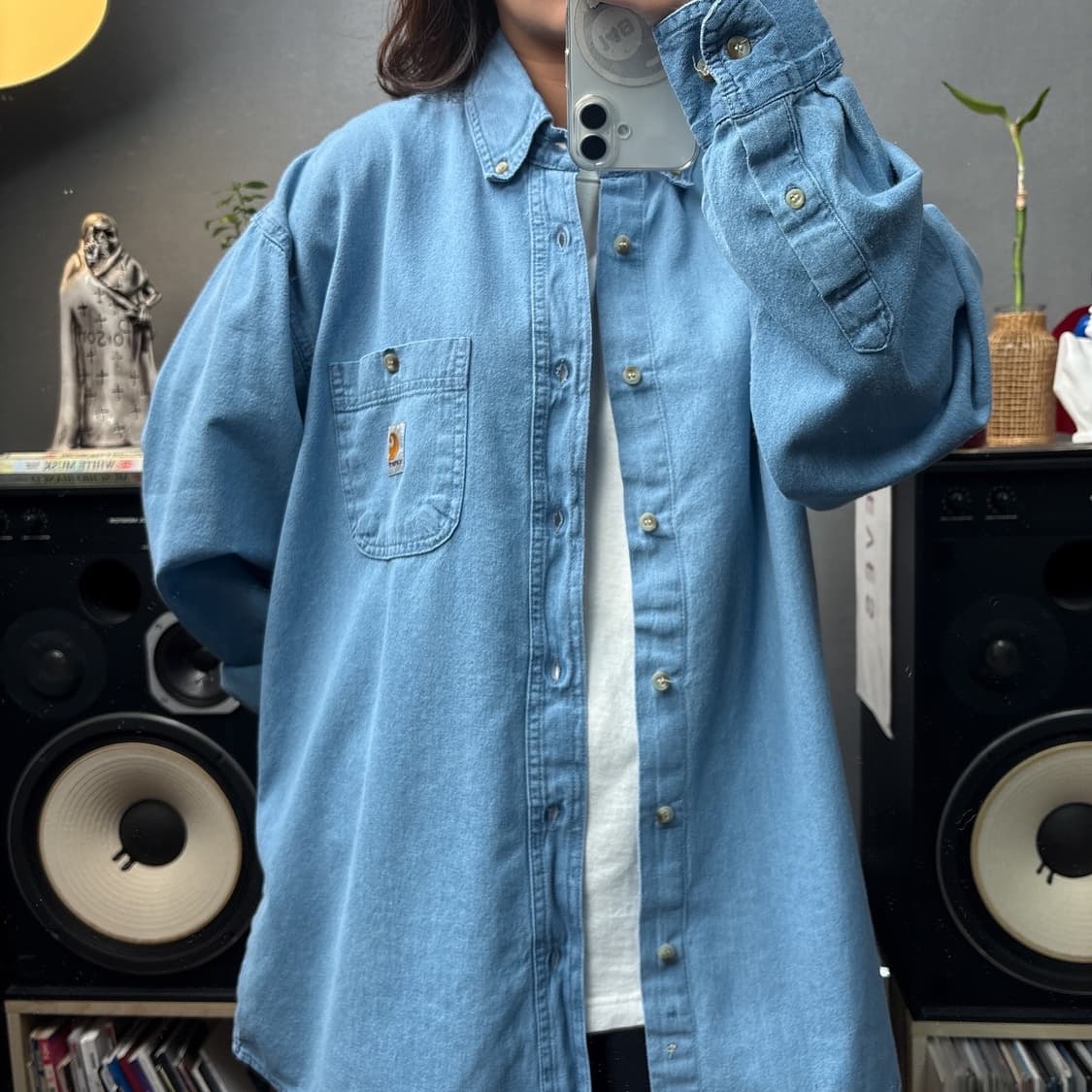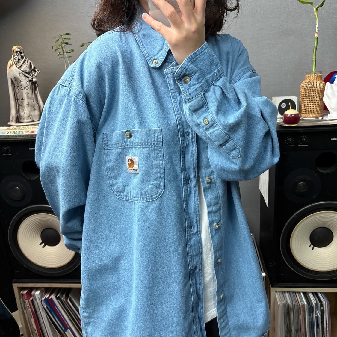 no.ic022 🧷comment : 칼하트사의 데님셔츠입니다 🧷 model spec : 149cm 48kg 🧷 size : L () 총장83 /가슴60/ 어깨54/소매길이60 🧷 price : 4.1 🧷 condition : B ⠀ ⠀ ⠀ ✔️ condition level tip ✔️ ⠀ A 미품수준의 깨끗한 상태 B 사용감은 있지만 오염/하자가 없는 상태 C 눈에 띄지않는 작은 오염/하자가 있는 상태 D 큰 이염/하자로 인해 수선이 필요한 상태 ⠀ ⠀ 🔍notice🔍 ⠀ ➰바로 착용하실수 있도록 전제품 세탁/케어 후 출고됩니다. ➰전제품 입금순 판매로 진행됩니다. ➰5만원이상 구매시 배송비무료입니다. ➰실측은 줄자로 측정되기때문에 재는 방식에 따라 차이가 있을수도 있습니다. ➰실제 색감과 최대한 비슷하게 후보정 후 업데이트하지만 실제색감과 상이할수있는점 양해부탁드립니다. ➰꼼꼼한 검수후 출고되지만 빈티지특성상 눈에 보이지않는 작은 오염/하자는 교환 또는 반품 사유가 되지않습니다. ➰빈티지 특성상 교환/환불 불가하니 신중한구매 부탁드려요 🙇‍♀️