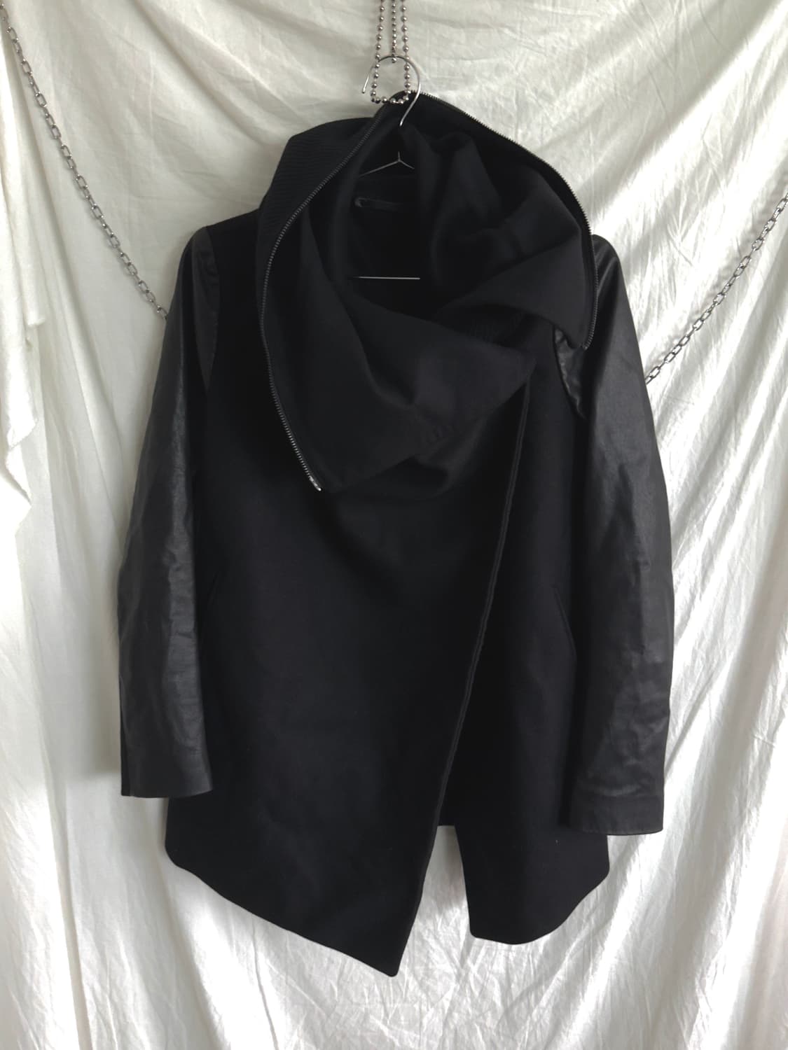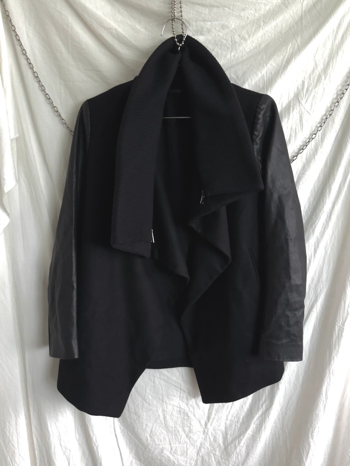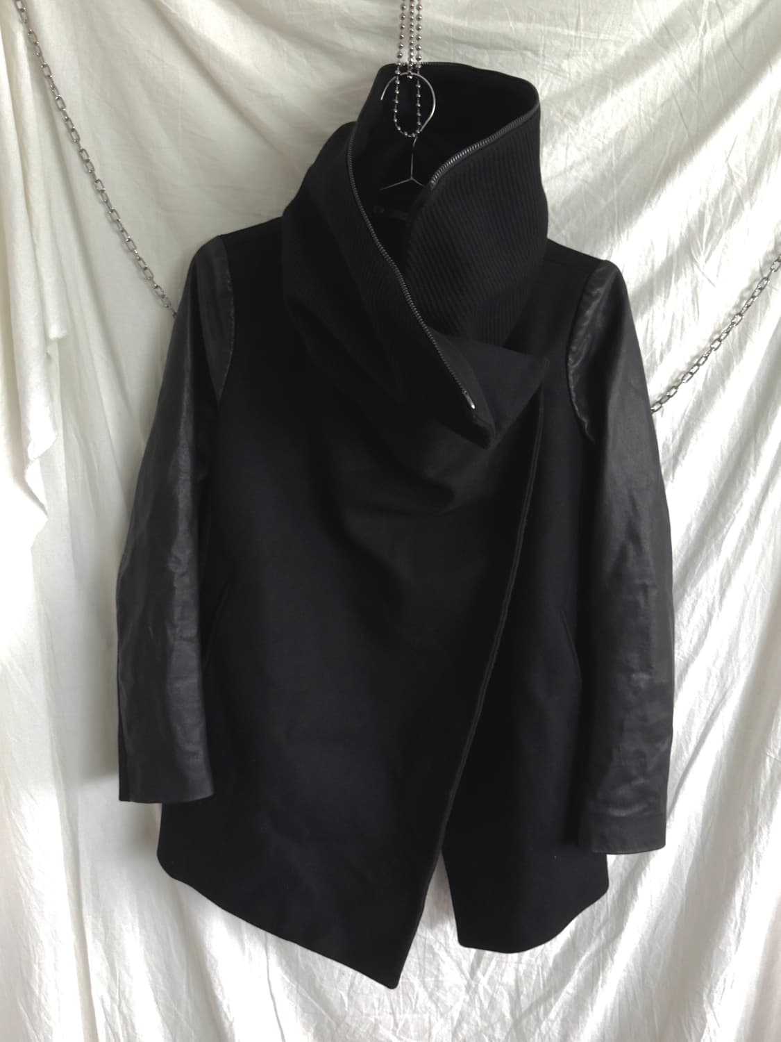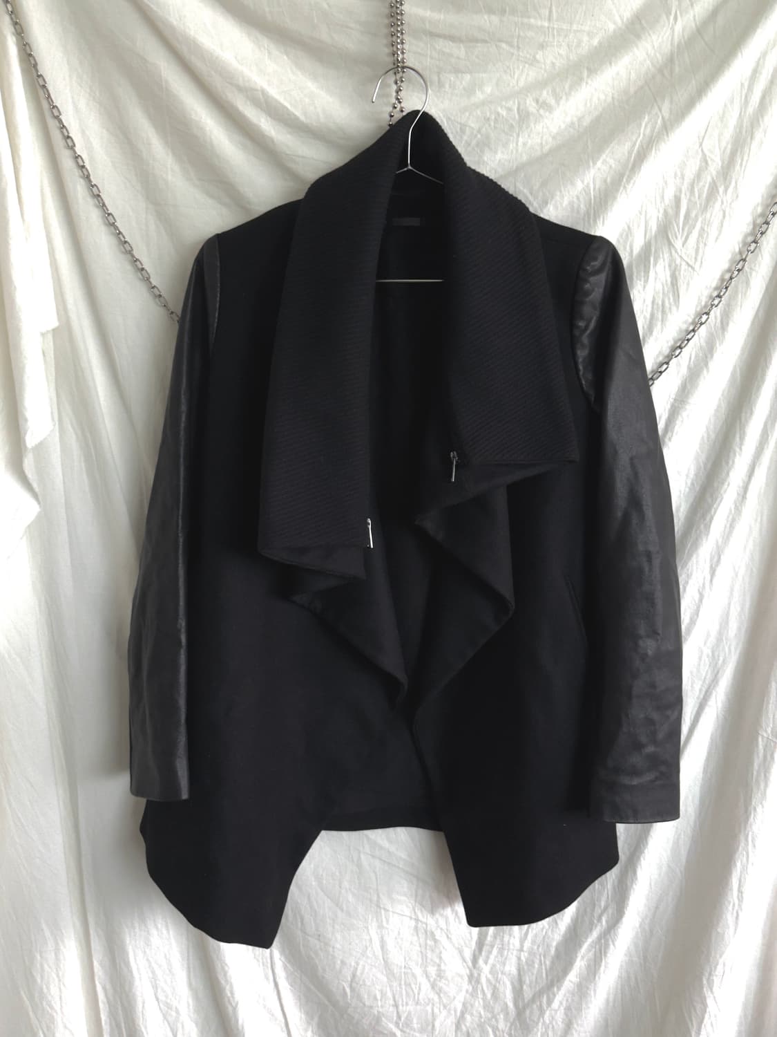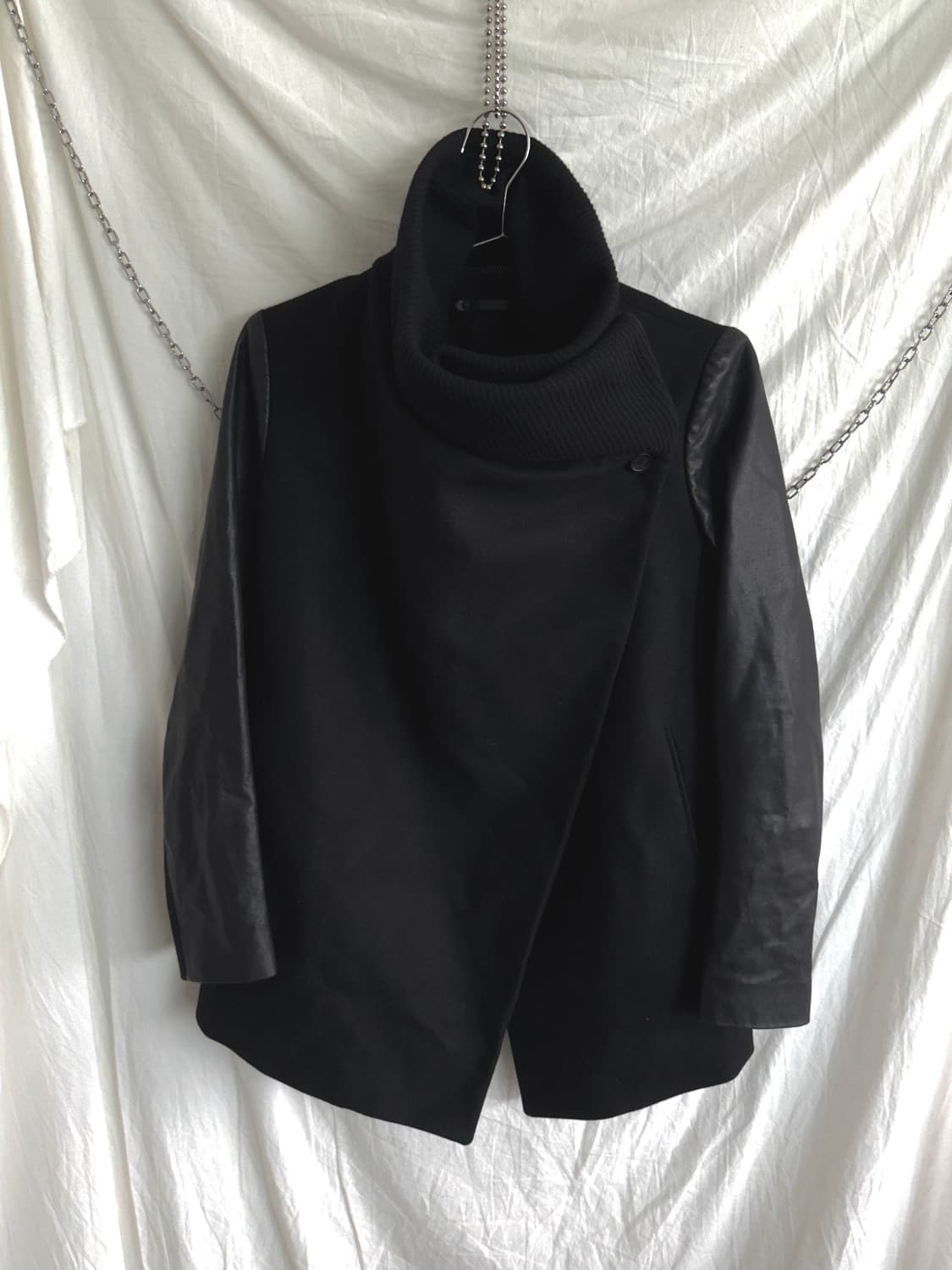 allsaints asymmetric high-neck draped jacket leather & wool / black ideal사의 지퍼를 사용하여 넥파트의 길이를 조절할 수 있습니다. UK 8 (womens ~55) shoulder 43 chest 47 sleeve 63 length 65 price : 250,000 (인스타그램 주문 or 매장 방문시 10% 할인) ig : @jeanand.juice
