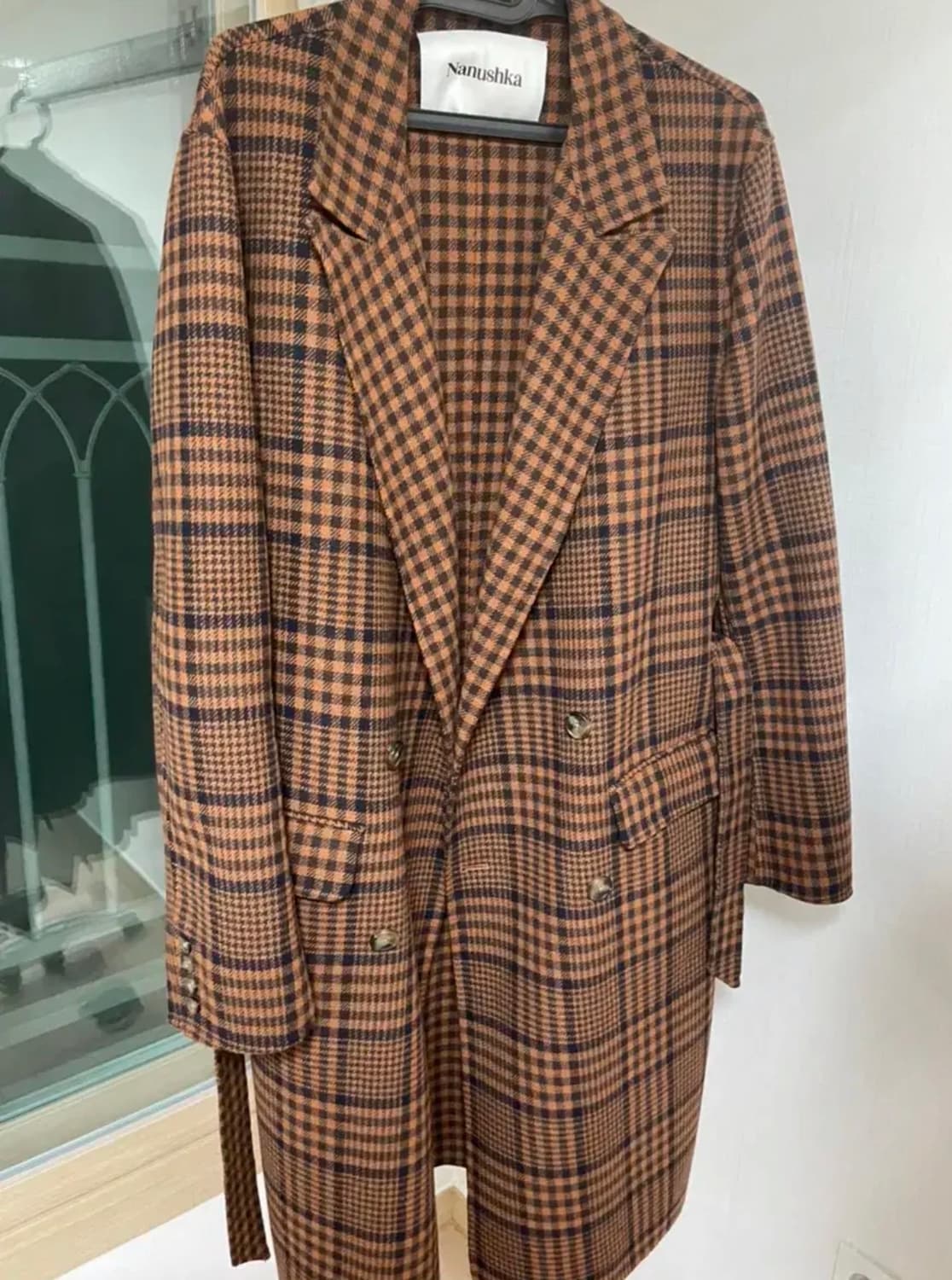 나누슈카 여성 울 실크 혼방 하운드투스 벨티드 코트