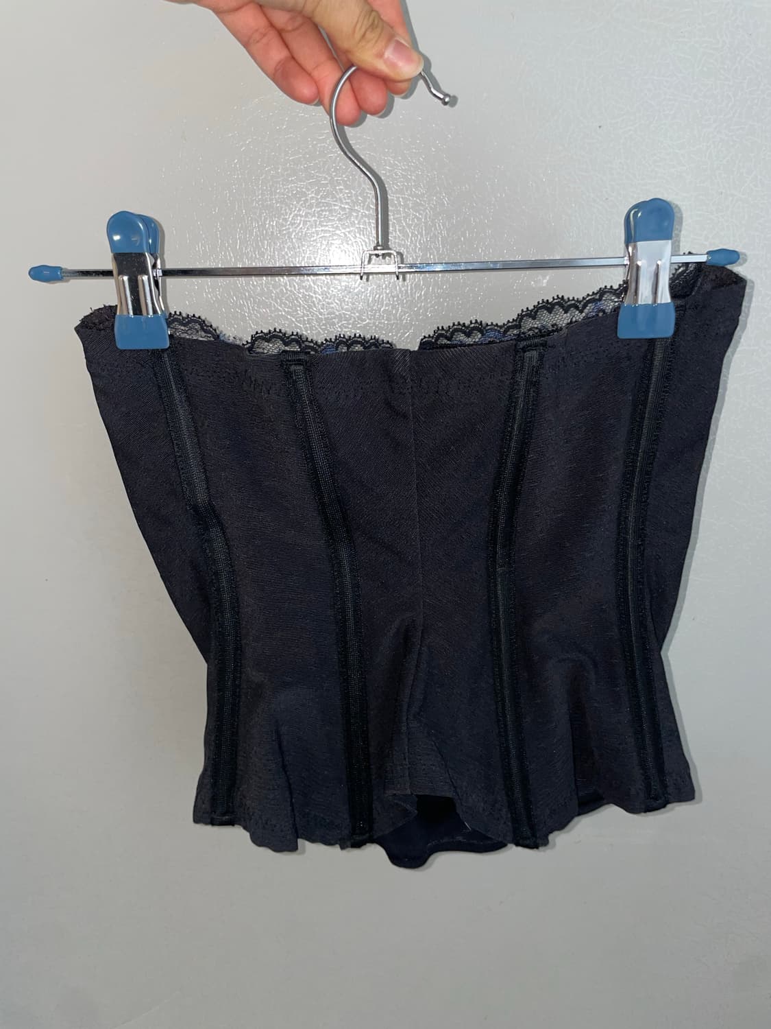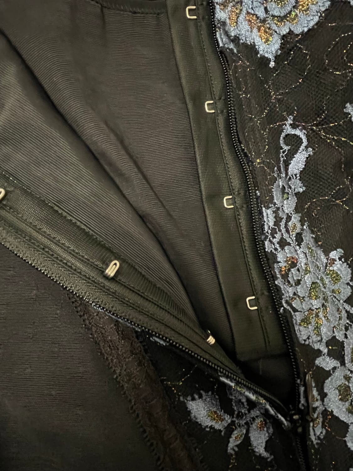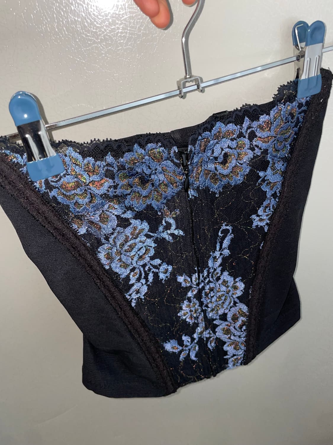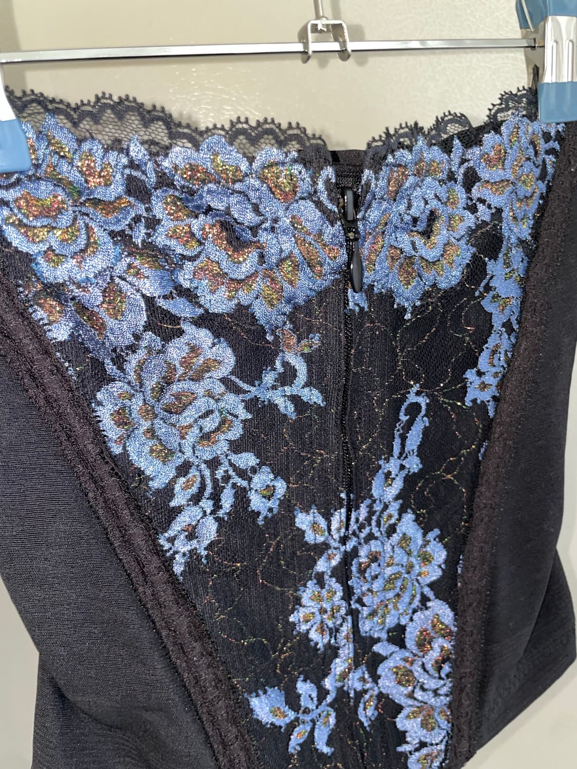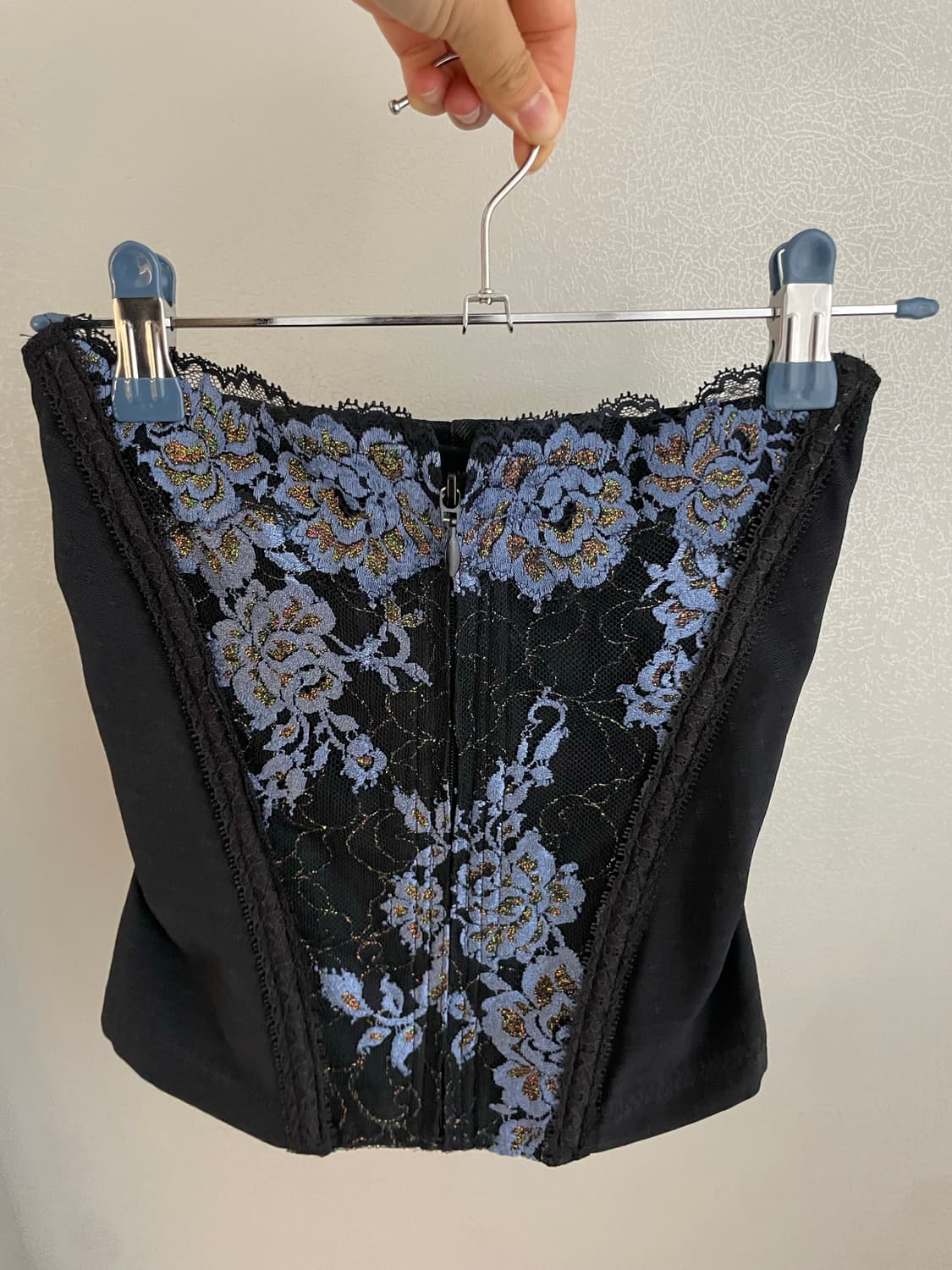 치수 (cm) 윗단면 28.5 가장 좁은 부분 단면 23 톤다운 파랑색 플라워 패턴에 오로라빛 실이 같이 자수놔진 코르셋입니다. 완전 오픈형이 아닙니다. 지퍼를 열면 얇은 신축성있는 면이 있어서 지퍼 열고 머리넣어서 슉 입고 후크 잠그고 지퍼 닫는 구조입니다. 가슴 아래로 착용하는 코르셋인데 탑처럼 착용이 되는 체형이라면 그것도 너무 이쁠것 같아요 xs-s인것같아요 제가 마른55일때 낑낑 잠궜어요 살 더 빼고 입어야지, 이쁘니까 못 보내 이러다가 보냅니다..