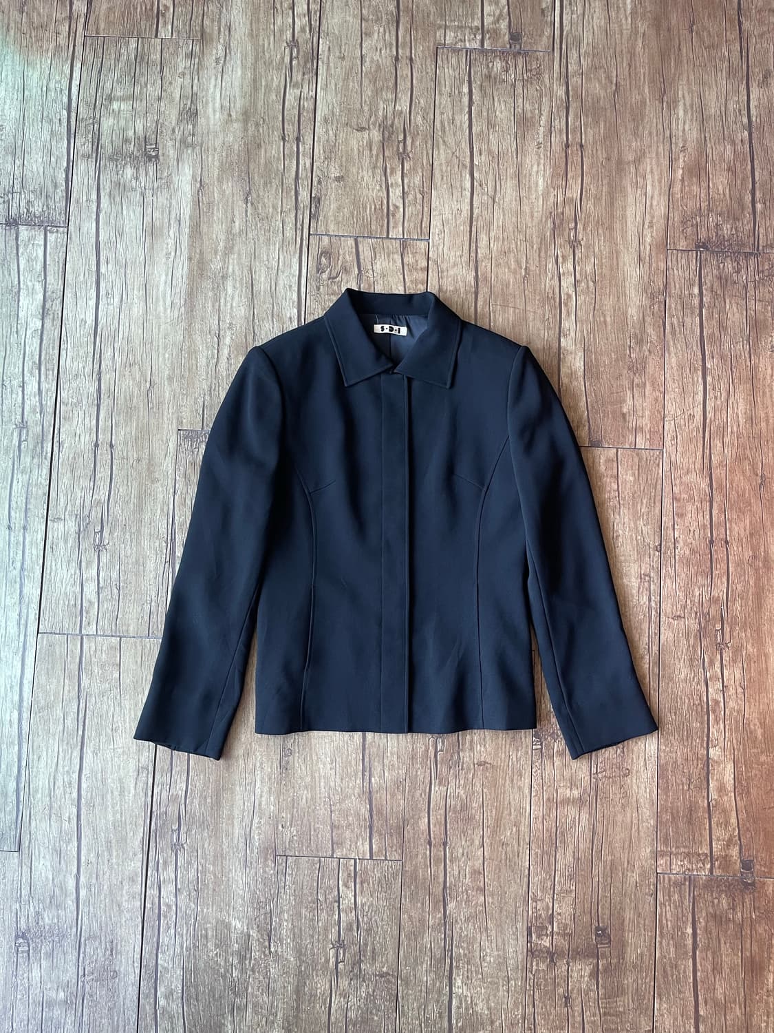 S·D·I Minimal Black Jacket Made in Japan *.Found line 군더더기 없이 정제된 실루엣의 블랙 자켓입니다. 프론트 여밈이 드러나지 않는 미니멀한 구조로, 전체적으로 단정하면서도 살짝 구조적인 라인이 살아 있습니다. 짧은 기장감과 자연스럽게 잡힌 허리 라인 덕분에 슬랙스, 스커트 모두 균형 좋게 매치되며, 데일리부터 포멀한 스타일링까지 활용도가 높은 아이템입니다. Condition : B+ Color : Black Size : S~M - 어깨 40.5 / 가슴 45.5 / 소매 59 / 총장 58 Material : 폴리에스터 90% + 10% (렉세 / レクセ) → 렉세는 일본에서 쓰는 레이온계(재생섬유) 소재. 실크처럼 부드럽고 드레이프 잘 생기는 타입 ▫️Fitting Comment (model. 164 M-L) : 55 정핏, 44~55 여유있을 것으로 예상합니다. 66은 슬림/이너 얇게 추천드립니다. Care * 드라이클리닝 권장 * 세탁기 사용 시 반드시 단독 세탁, 약한 코스 * 건조기 사용 금지 ㅡ Notice · 10만원 이상 무료배송 / 합배송 가능 · 빈티지 특성상 교환·환불이 어려울 수 있습니다. · 실측은 소폭의 오차가 있을 수 있습니다.