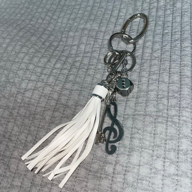 스틸 슈혼 ㆍ화이트 테슬 ㆍ깃털 팬던트 구성입니다. 스틸 슈혼과 화이트 태슬에 깃털 참이 포인트로 은은한 보랏빛 걈성을 더했습니다. 가방ㆍ바지ㆍ키홀더 등 어디에나 매치하기 좋은 실용성과 스타일을 함께 담은 아이템입니다.