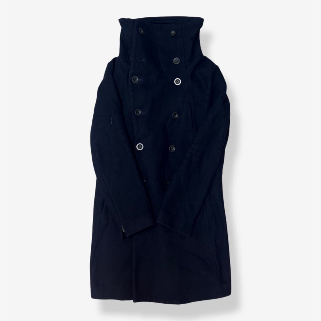 Size 2 • 250,000 • 더 비리디 안느의 시그니처 하이넥 더블 브레스티드 코트 • 어두운 톤의 다크 네이비와 나폴레옹 스타일의 더블 브레스티드 디테일이 포인트 • 두툼한 울 원단의 코트 • 인기 시리즈 (cm) 어깨 48 가슴 53 길이 86