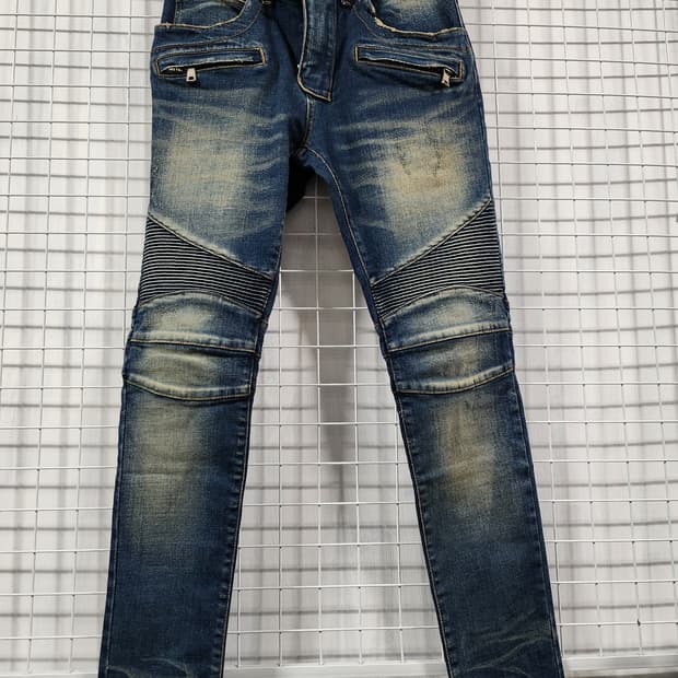 ISAMU KATAYAMA BACKLASH Heavy Faded Slim Tapered Denim 슬림 테이퍼드 실루엣 기반의 5포켓 데님으로 전면 하이라이트와 허벅지·무릎 구간의 강한 위스커링 페이드가 중심을 잡으며 밑단으로 갈수록 자연스러운 스태킹이 형성됩니다 버튼 탑과 리벳, 옐로 계열의 대비 스티칭으로 내구 포인트를 주고 후면은 백래쉬 시그니처 메탈,레더 플레이트 패치와 포켓 하단 X 바텍 스티치로 아이덴티티를 정리합니다 전체적으로 워싱 대비가 선명해 레더 부츠,하이탑과 함께 하체 라인을 날카롭게 만드는 제품입니다 Condition: A Size: M Waist: 38/ Thigh: 26/ Hem: 15/ Length:105(cm) Fabric: Cotton, Polyurethane, Cow Leather