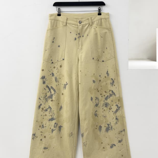 24aw 컬러 페인팅 팬츠 와이드핏 버전입니다 밑단쪽이 좁아져서 약간 테이퍼드 느낌 나고 생각하시는 일본 특유의 핏 느낌 납니다. 지금 구할 수 없는 매물이고 몇번 안 입었는데 스타일이 안맞아서 판매합니다. COTTON 100% • 페인팅 디테일 • 밑단 데미지 • 후크 클로저 • 지퍼 플라이 • 후면 플랩 포켓과 립 포켓 • 와이드 핏