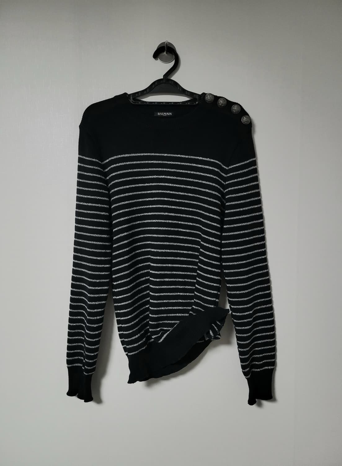 Balmain 은사 견장 니트 Made in france 은사를 꼬아만든 스트라이프 패턴이 은은하게 반짝입니다. 표기 size XS 어깨 43 총장 66 상태 사진 참고, 구매시 상점 소개글 필독