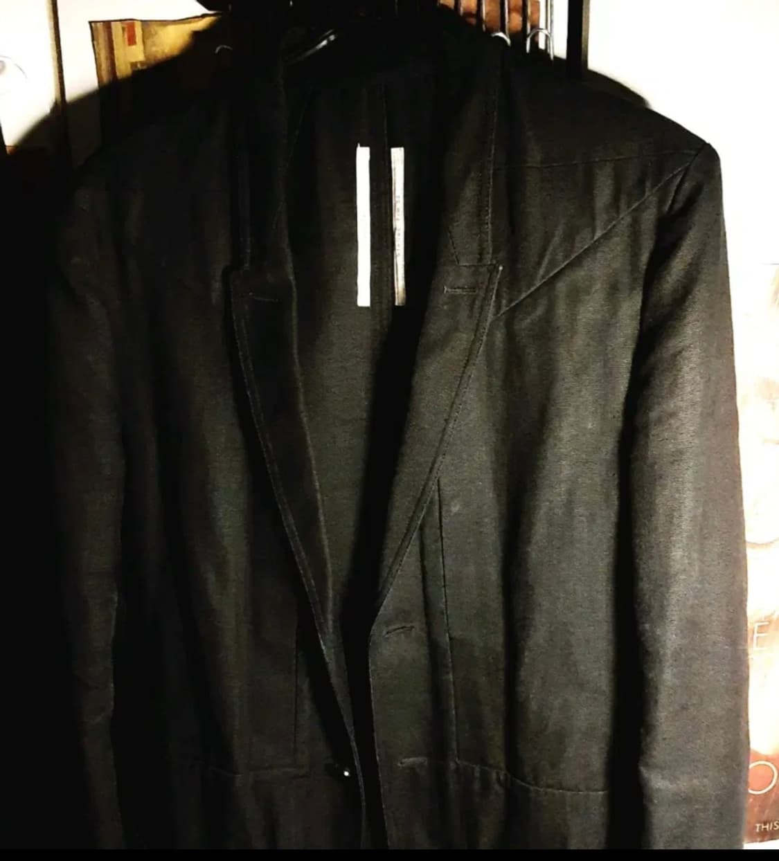 릭오웬스 리도 블레이저 입니다. 일본 매장에서 구매후 2회 착용만 하고 보관해서 상태가 아주 좋습니다. 2번째 사진에 소매에 흰색은 오염이 아니라 소재 특성상 보이는 특징입니다. 구매당시에도 똑같았습니다. 사진에서 표현이 안되지만 어두운 블랙이고 굉장히 매력적인 소재를 사용했습니다 2체 하시분인 연락주세요 택 미포함 어깨 폭:47cm ・품:52cm ・소매 길이:72cm ・옷길이:96cm