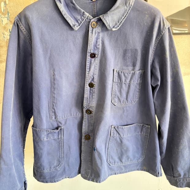 빈티지 80년대 프렌치 자켓입니다. 군데군데 페인팅이 자연스럽게 묻어있고 자연스러운 워싱 들어가있습니다. 어깨52 가슴132 기장67 팔기장64