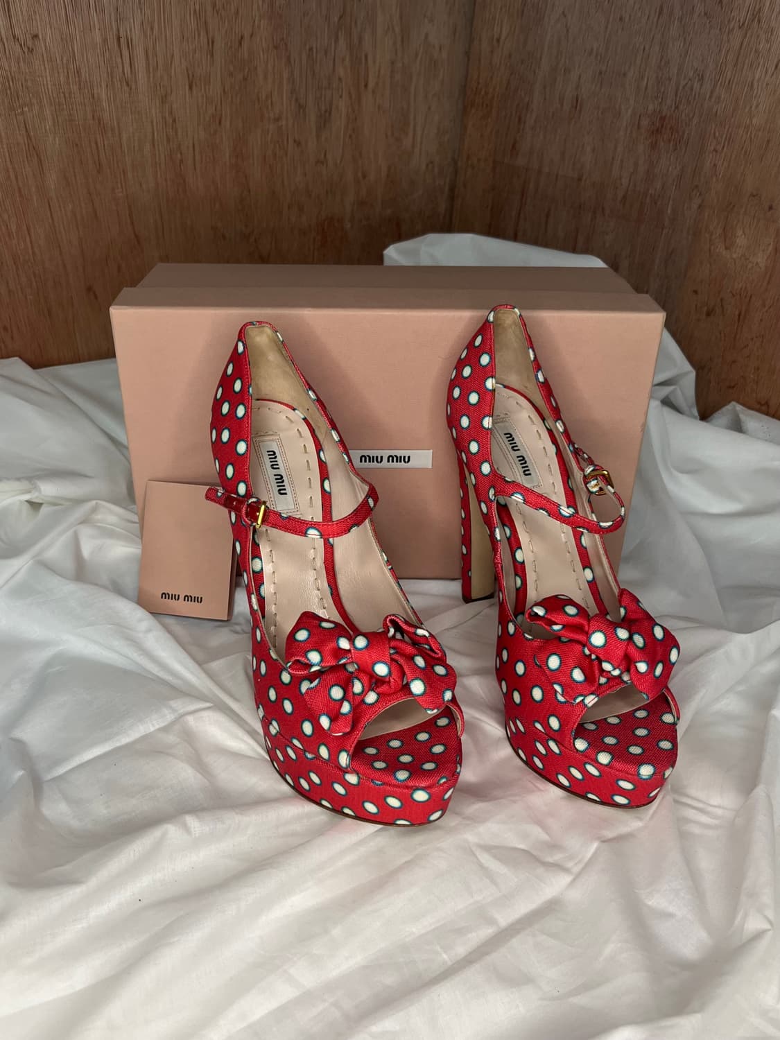 ⦁ Miu Miu Red Polka Dot Ribbon Platform Heels ⦁ Brand ㆍMiu Miu ⦁ Season ㆍ2010 SS ~ 2012 SS (est.) ⦁ Size ㆍEU 39(250mm) ⦁ Material ㆍTextile upper ㆍLeather lining ㆍLeather sole ⦁ Condition ㆍ9/10 ⦁ Features ㆍVivid red base with contrasting polka dot pattern ㆍLarge front ribbon detail ㆍMary Jane strap with buckle closure ㆍOpen toe platform silhouette ㆍHigh stiletto heel with elevated platform for balance ㆍIconic playful Miu Miu aesthetic ㆍBox not included ⦁ Price ㆍ169,000₩