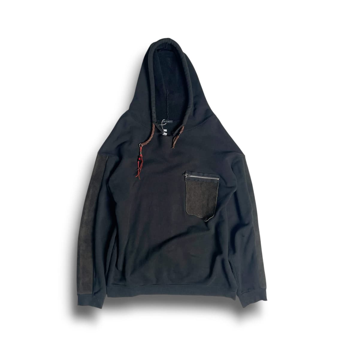 Milkboy suede layered hoodie 입니다. 코튼 원단, 포켓과 슬리브 에 소가죽 스웨이드 원단 레이어드, 전 사용자가 후드 끈을 가죽 끈으로 교체한 후드 입니다. 부분 데미지 있습니다. 어깨+팔 75 가슴 56 총장 63