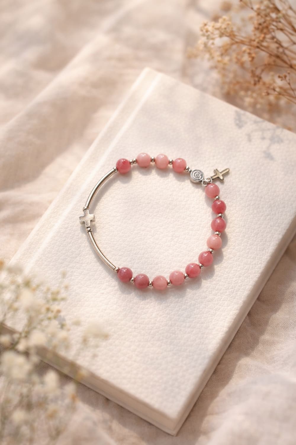 은은한 핑크빛이 매력적인 핑크썬스톤 6mm 묵주팔찌입니다. 차분한 핑크 컬러 위에 써지컬 십자가, 오닉스 장미, 십자가 참을 더해 단정하면서도 부드러운 분위기로 제작했어요. 묵주팔찌 느낌은 살리되 일상에서도 부담 없이 착용할 수 있도록 여리하고 편안한 무드로 완성한 디자인입니다. 핑크썬스톤은 따뜻한 에너지와 밝은 기운의 의미로 많이 사랑받는 원석이라 나를 위한 작은 선물로도, 소중한 분께 전하는 마음으로도 잘 어울려요. - 원석: 핑크썬스톤 6mm - 부자재: 써지컬 십자가 / 오닉스 장미 / 십자가 참 - 줄 종류: 우레탄 - 사이즈: 여성 기본 17cm - 맞춤 제작: 가능 / 20cm 이상 추가금 있음 - 상태: 새상품 모든 원석팔찌는 셀레나이트 접시에서 정화한 후 발송해드리며, 예쁘게 상자 포장해서 보내드려 선물용으로도 가능합니다. 손목둘레에 맞춘 제작 원하시면 요청란에 손목둘레를 적어 주세요 :) 해피블레스 맑은 하루를 위한 작은 축복.