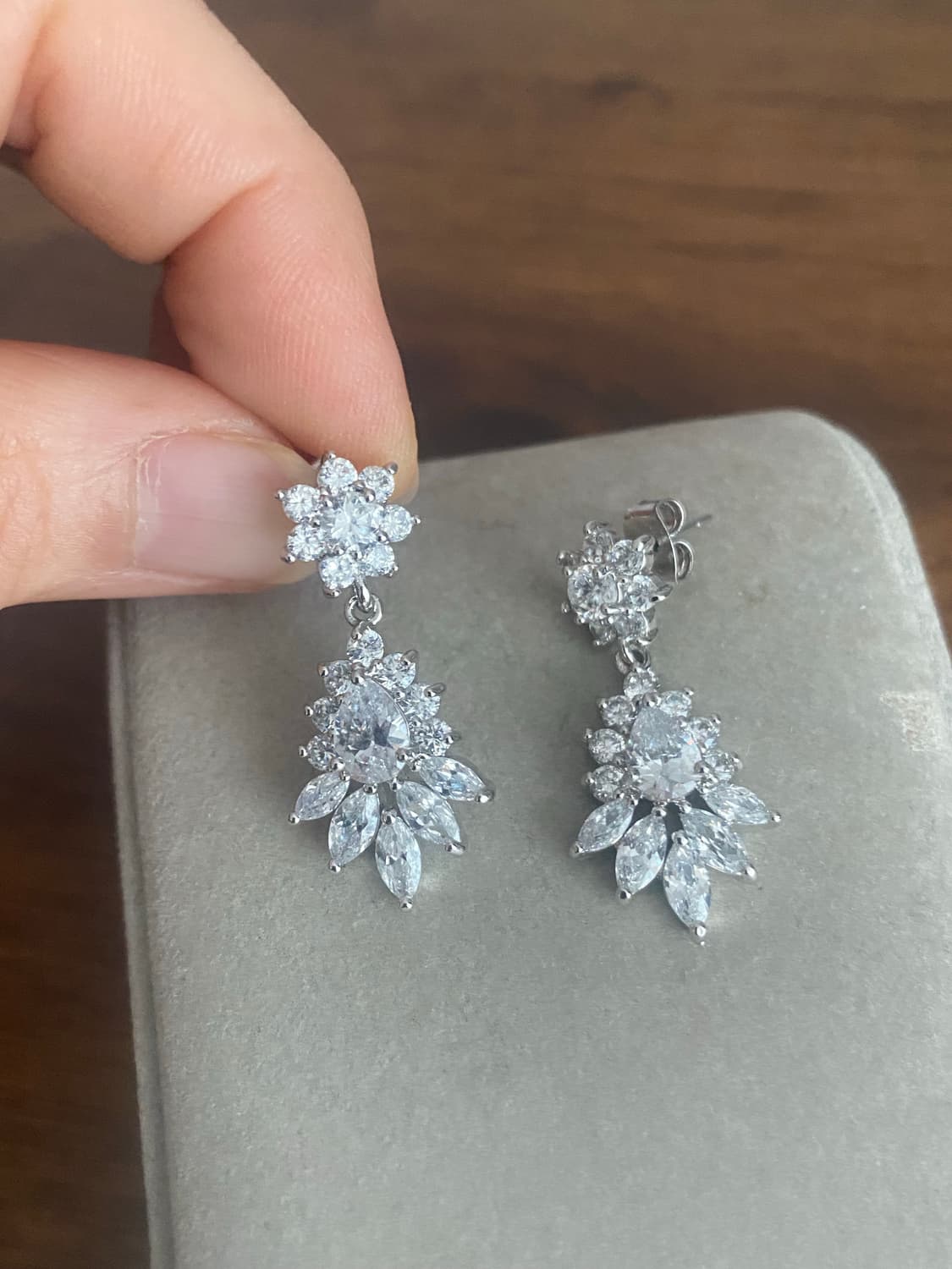 섬세한 큐빅세팅이 돋보이는 귀걸이 입니다. 악세서리 제품이지만 큐빅 한개한개 손으로 작업해서 발물림 기법으로 세팅되어 있고 마무리도 깔끔한 퀄리티 높은 아이템 입니다. 화려하고 존재감 있는 디자인 입니다. 사용감 전혀 없이 거의 새제품 같이 깨끗하고 좋은 상태 입니다. 실측사이즈 14.3x31.7mm
