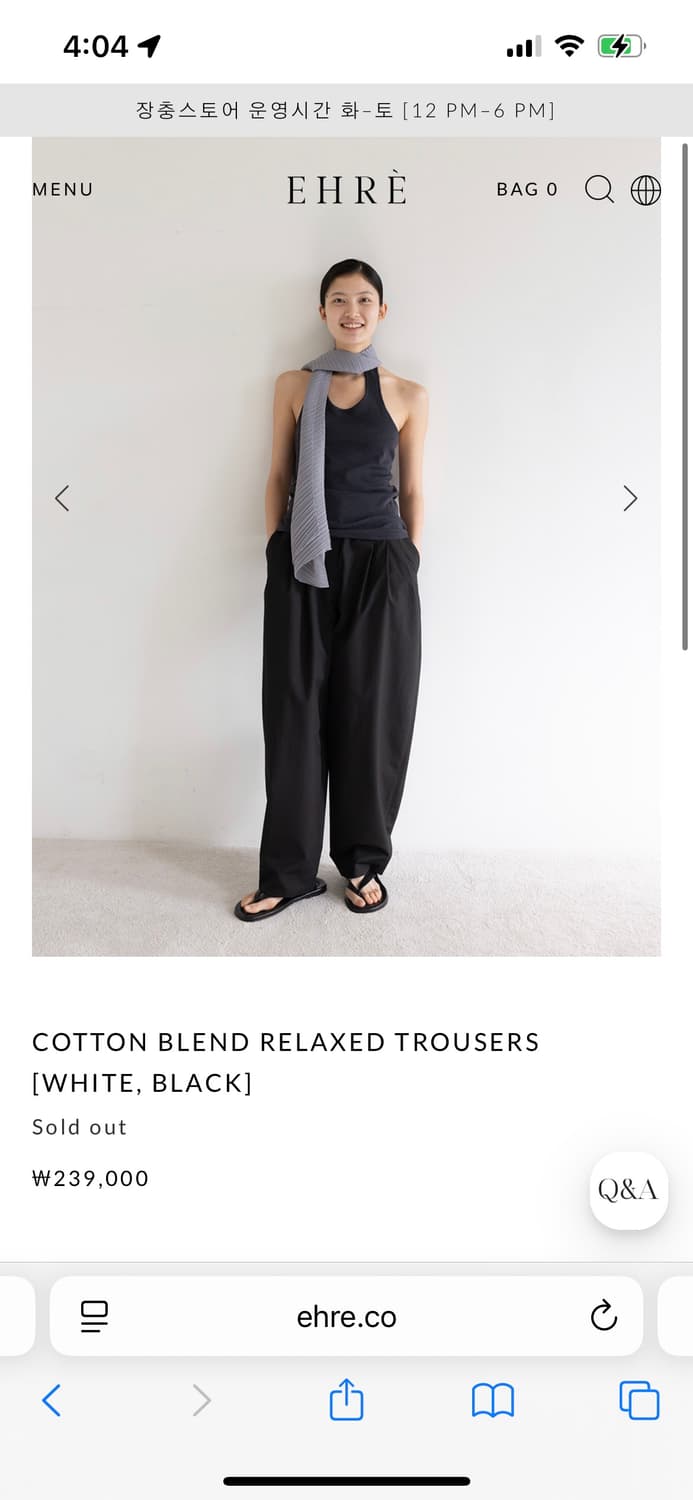 COTTON BLEND RELAXED TROUSERS 블랙컬러 36 사이즈 한번잠시 착용한 새상품급 상태입니다. 반품안되는점 참고해주세요 우체국택배로 발송