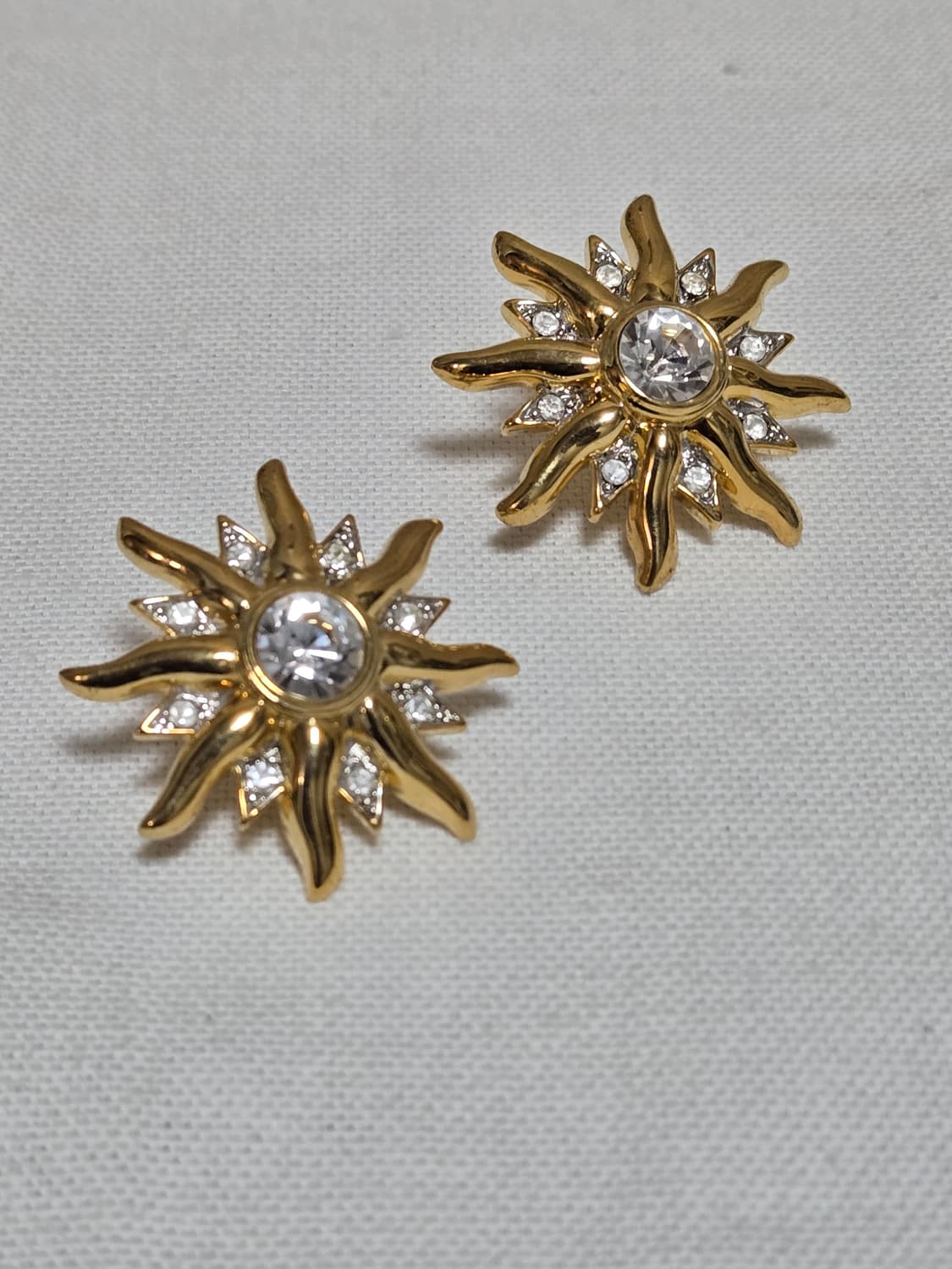 프랑스 브랜드 카부숑 새상품 사이즈 실측 확인 태양을 형상화한 선버스트 디자인 이어링입니다. 중앙에는 투명한 라운드 컷 스톤이 세팅되어 있고, 주변으로 작은 스톤들이 파베 형태로 촘촘히 들어가 반짝임이 강조됩니다. 골드톤 메탈의 유려한 곡선 디테일이 입체감을 주며, 빈티지 무드와 모던한 포인트가 함께 느껴지는 스타일입니다. 착용 시 얼굴 주변에 자연스럽게 포인트를 주는 디자인이라 단독으로도 충분히 존재감 있습니다. 타입: 스터드 이어링 컬러: 골드톤 스톤: 크리스탈(중앙 + 서브 파베)