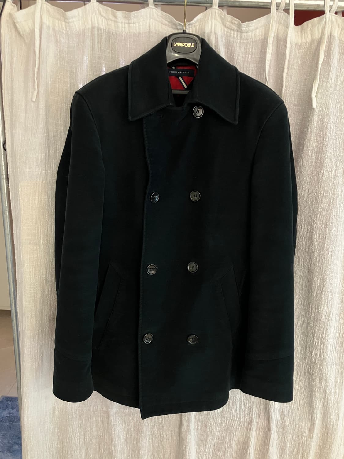 타미 힐피거 피코트 진한 네이비 컬러 입니다. 표기 사이즈는 S이고, 크게 나와서 국내 사이즈로는 100 정도 됩니다. 비흡연 환경입니다.