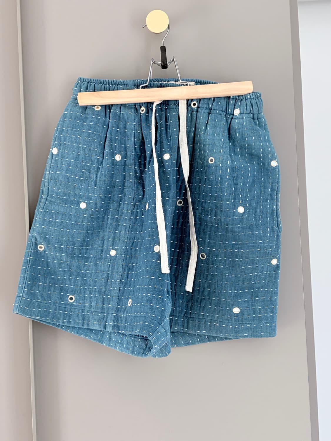 최근 도버스트릿마켓에서도 큐레이팅에 포함된 인도의 수작업 클로징 브랜드의 반바지입니다. 보이는 패턴 속 원형에는 실제로 거울이 박혀있습니다. 작년 런던의 편집샵에서 구입하여 1회 착용했습니다.