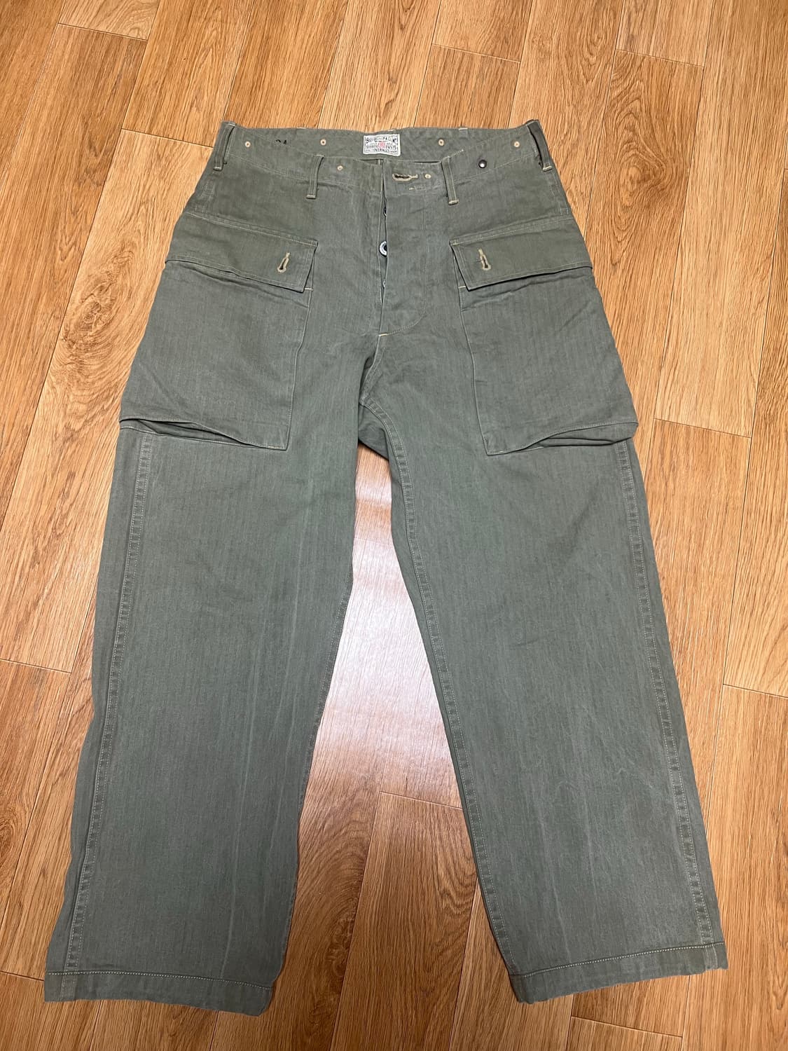 허리 38.5 허벅지 31-34 밑위 31-34.5 밑단 22 기장 96 (밑단 살려서 수선, 수선전이라고 해봐야 원래도 짧게 나온거라…) 버즈릭슨 특 허리가 좀 작게 나옵니다 탭사이즈는 32 지만 실측상 31 이하분들 혹은 여성분들이 입으셔도 좋을 것 같아요 국내 샵기준 정가는 30이 넘고 직구해도 관세맞는 가격이라 국내에선 매물이 잘 없습니다 워낙 바지 자체만으로 코디가 완성되는 없어서 못입는건지 아니면 바지 자체 존재감이 너무 강력해서 부담스러워서 못입으시는분들도 많은듯 해외에선 종종 여성분들도 입으시던데 포켓덕분에 엉덩이 볼륨감이 귀엽고 섹시합니드 색감이 워싱이 많이 들어간 제품이고 원단은 군특 헤링본트윌