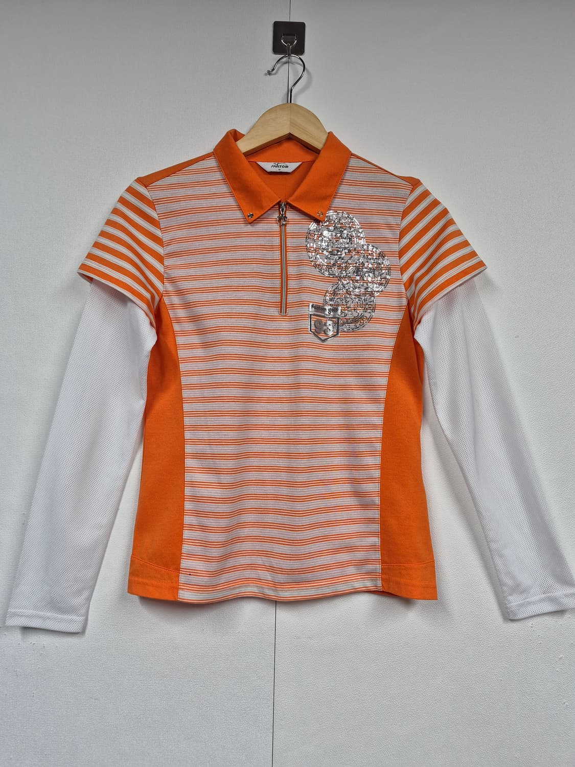 실측 사이즈 45 × 58 가반 총장 11 × 60 어깨 소매길이 오렌지 컬러 반팔 소매에 메쉬 긴팔로 한여름에 자외선 차단에 좋구 시원 합니다. 디테일 이쁜 긴팔 티셔츠.