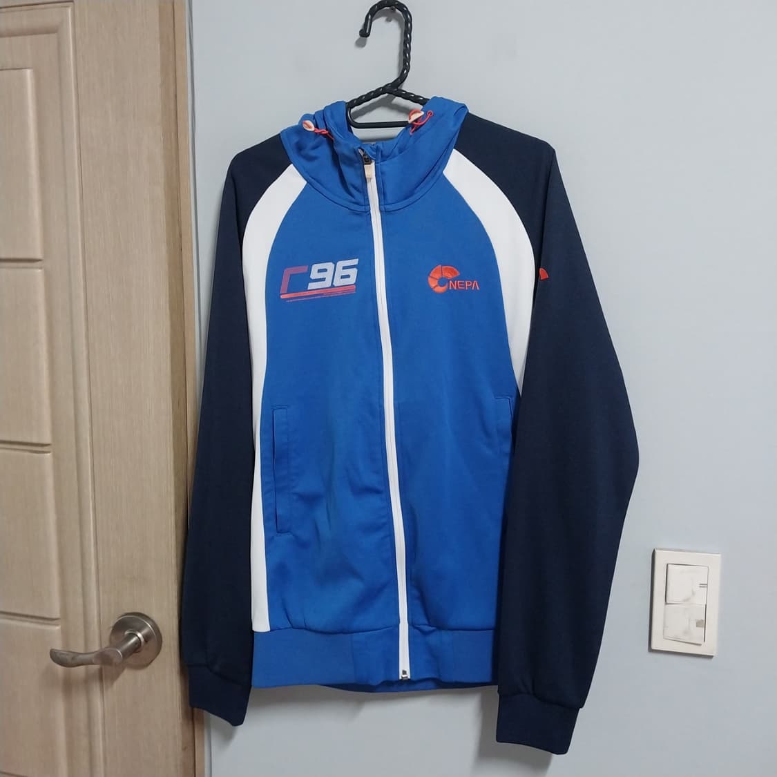 네파에서 나온 후드 집업이에요 블루 색상에 깔끔한 디자인으로 어디에나 잘 어울려요 사이즈는 남성 90 에서 슬림 95 정도 가볍고 편안해서 활동하기 좋아요 총길이 67 가반 48 팔길이어깨포함 72