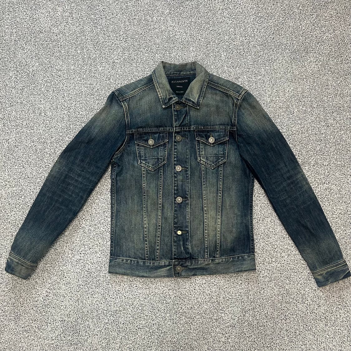 📌 ALLSAINTS Denim Jacket — Washed Indigo / Slim Fit (마지막 사진참고 눈에 띄지 않는 사용에 지장없는 아래에서 두번째 단추 손상 ) 데님 특유의 거친 질감 위에 자연스럽게 스며든 워싱이 인상적인 올세인츠 데님 자켓입니다. 전체적으로 톤 다운된 인디고 컬러에 페이딩이 은은하게 들어가 있어, 과하지 않으면서도 깊이 있는 락시크 무드를 만들어줍니다. 슬림하게 떨어지는 실루엣과 절제된 디테일이 특징으로, 클래식한 트러커 디자인을 기반으로 하면서도 올세인츠 특유의 도시적인 감각이 잘 살아있는 모델입니다. 가슴 포켓과 메탈 버튼, 스티치 라인이 균형감 있게 구성되어 단독 착용은 물론 이너 레이어링에도 활용도가 높습니다. 실측 어깨 44 가슴 47 소매 65 총장 65 표기 s.